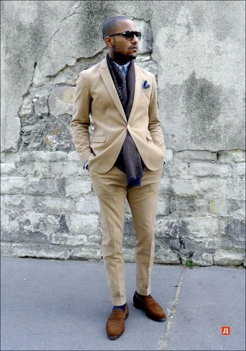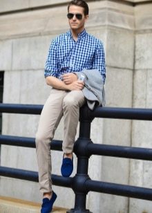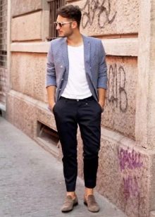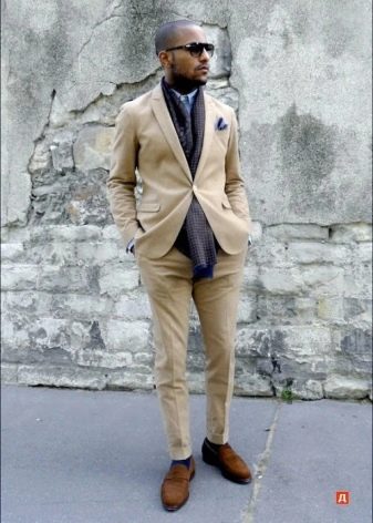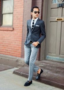 - Morbidi mocassini beige in stile nappa in morbido camoscio dall'aspetto chic con pantaloni grigi affusolati con frecce. Al piano di sopra, un uomo può indossare una polo sportiva in un colore bianco universale. Se lo si desidera, un tale tandem può essere integrato con una giacca o una giacca calda per abbinare il colore delle scarpe.