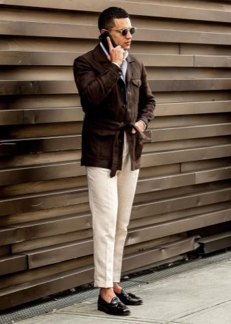 - I mocassini marroni in vera pelle andranno bene non solo con gli affari, ma anche con le cose di tutti i giorni. Ad esempio, possono essere jeans dritti blu scuro, una maglietta leggera e una giacca color kaki con molte tasche cucite. L'ensemble risulterà semplice, ma armonioso e completo.