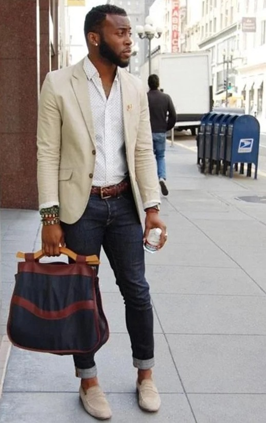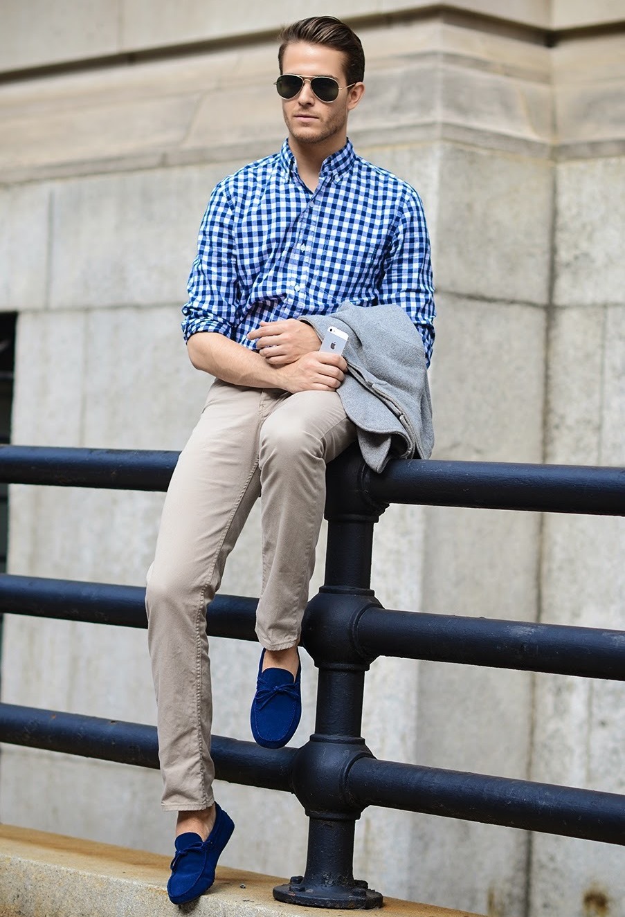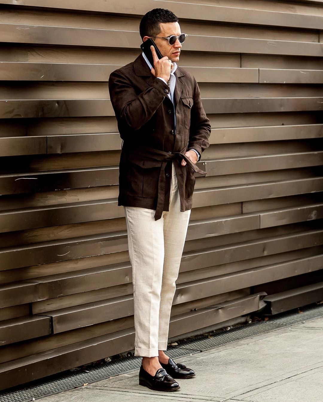- I mocassini con nappine in camoscio marrone chiaro possono essere abbinati a pantaloni bianchi con cinturino in pelle marrone e una camicia a maniche lunghe azzurra.