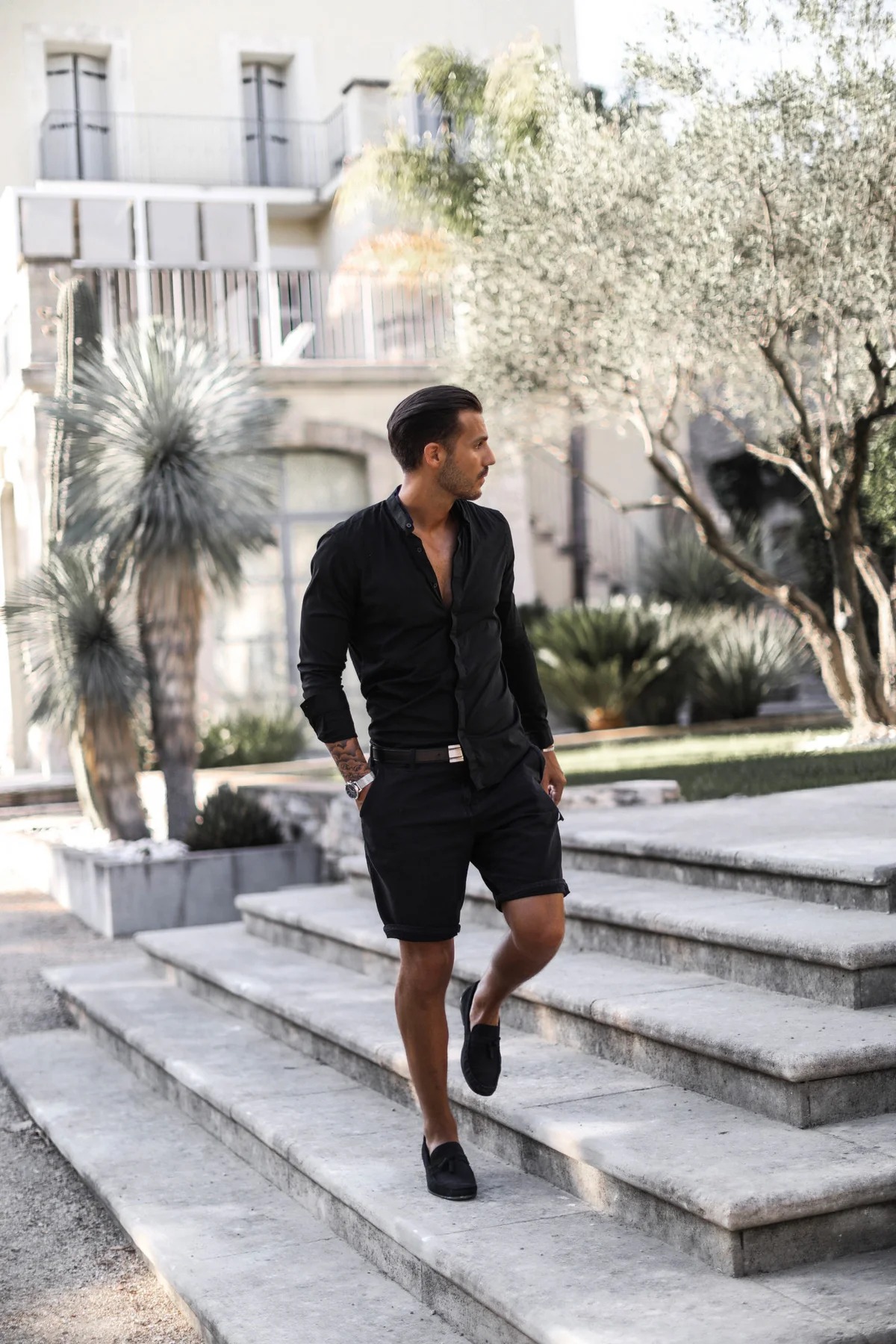 - Come accennato in precedenza, i mocassini neri funzionano meglio se abbinati a vestiti dello stesso colore. Per un look audace e casual, scegli una camicia nera a maniche lunghe, pantaloni corti color cachi e mocassini neri con una riga dorata a contrasto sulla linguetta.