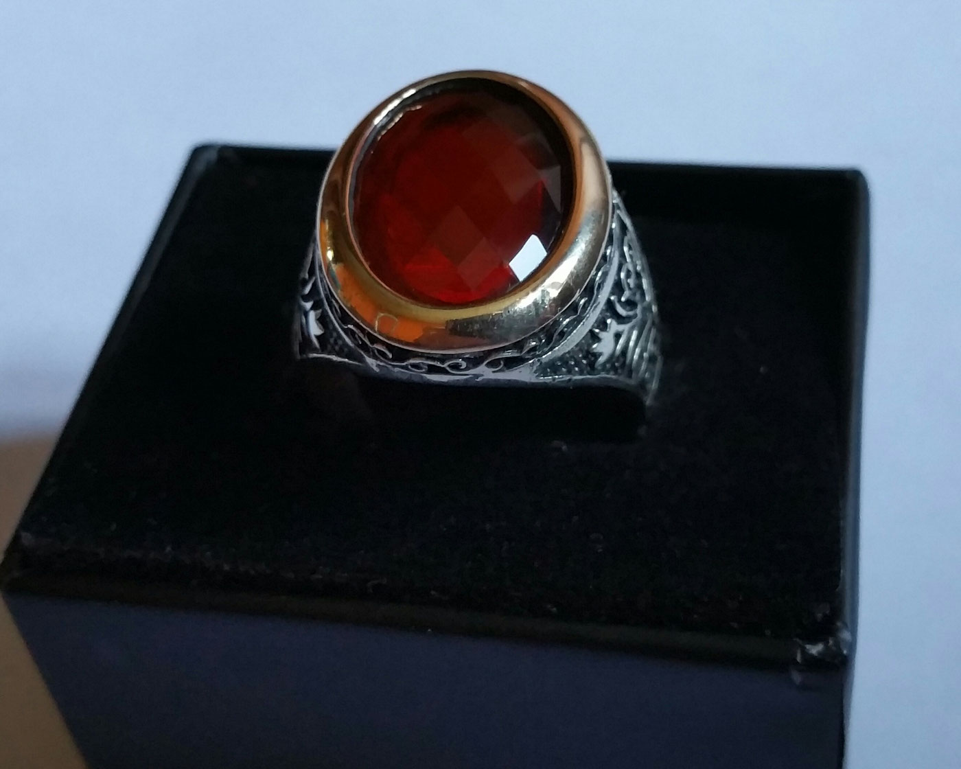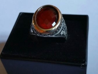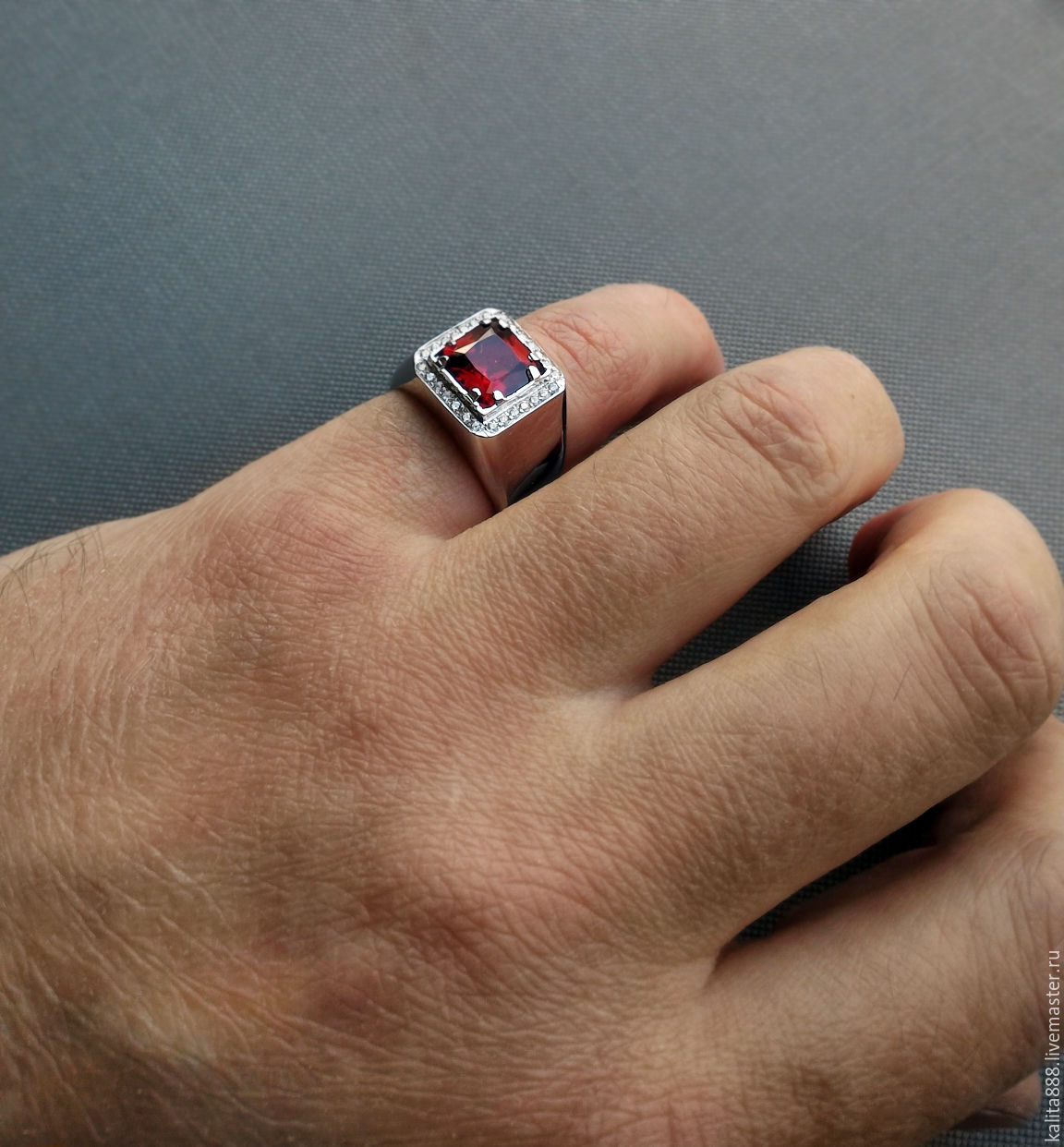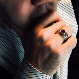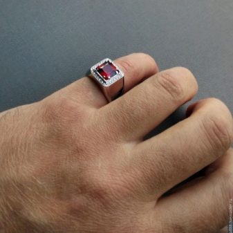 Molto spesso, gli uomini scelgono anelli d'argento, il metallo giallo non è così popolare tra il sesso più forte... La tonalità d'acciaio dell'argento completa perfettamente la pietra rossa brillante. Ma tali decorazioni richiedono una pulizia regolare. I sigilli di rubino realizzati in oro bianco sono spettacolari.