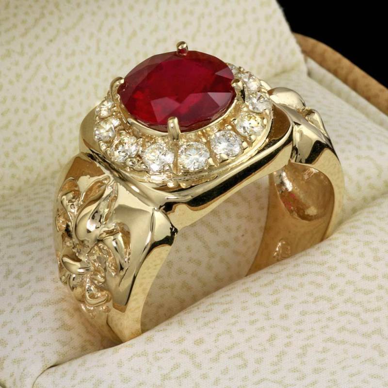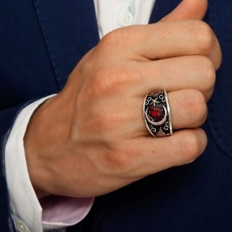 La particolarità degli anelli da uomo con un rubino è la loro dimensione. La larghezza di tali anelli supera i 5 mm, di regola sono decorati con una grande pietra. Rare sono le varianti con motivi geometrici e numerose piccole pietre.