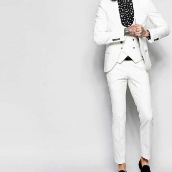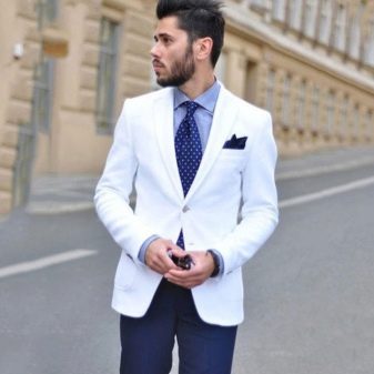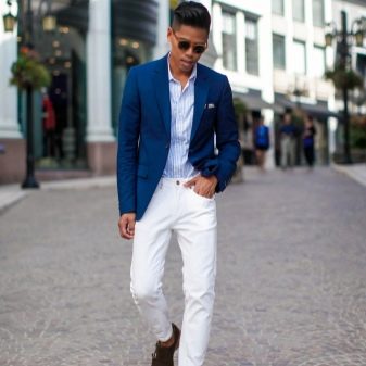 - pantaloni bianchi classici abbinati a un blazer blu scuro - una combinazione di base che porta l'aristocrazia all'immagine;