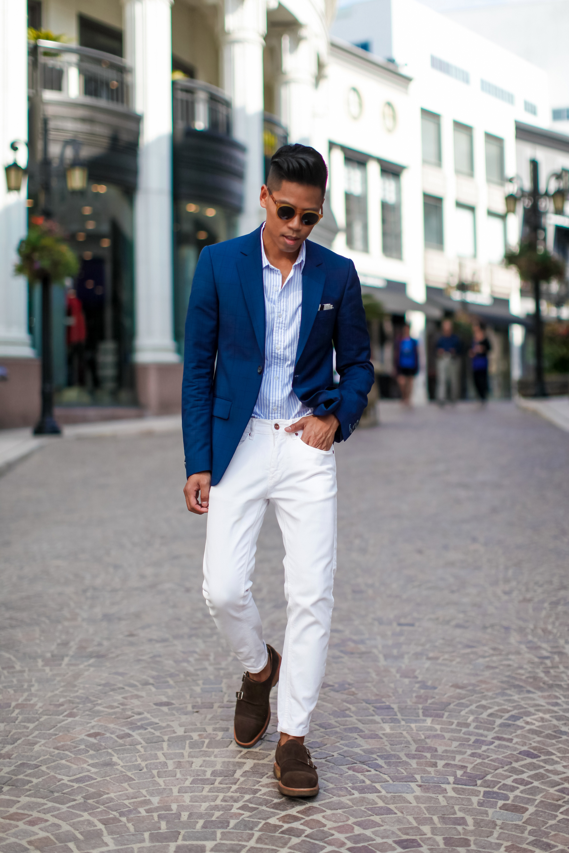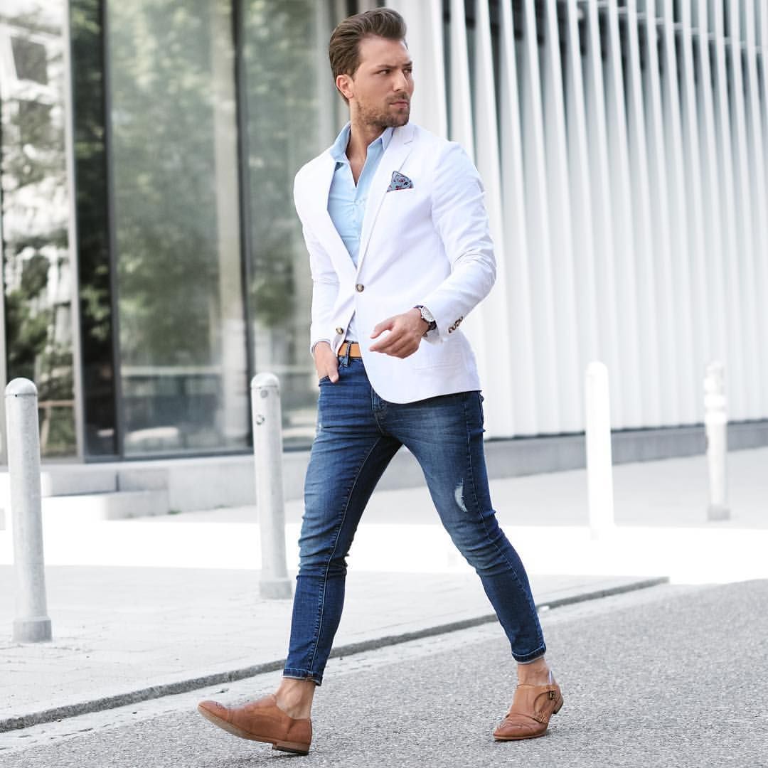 I jeans sono considerati il paio di maggior successo per una giacca informale, seguiti dai pantaloni. Il colore e lo stile del blazer dovrebbero corrispondere alla natura della situazione della vita.