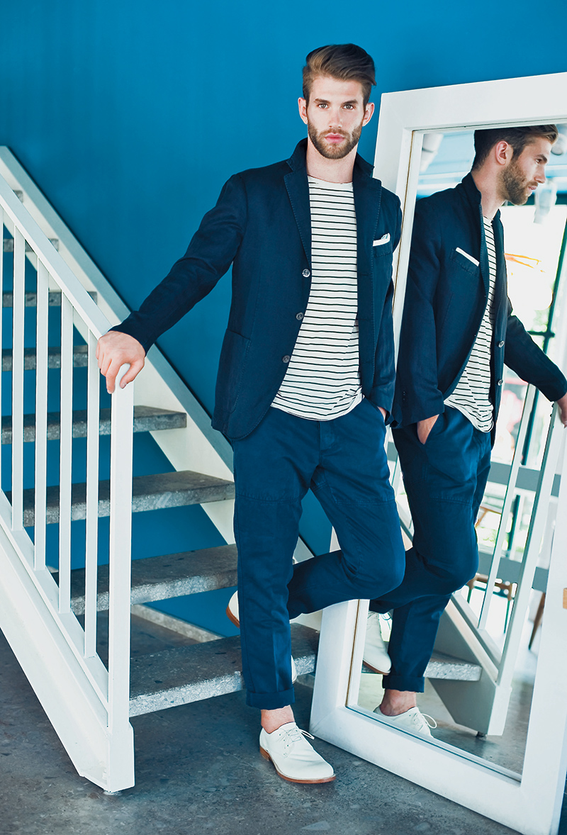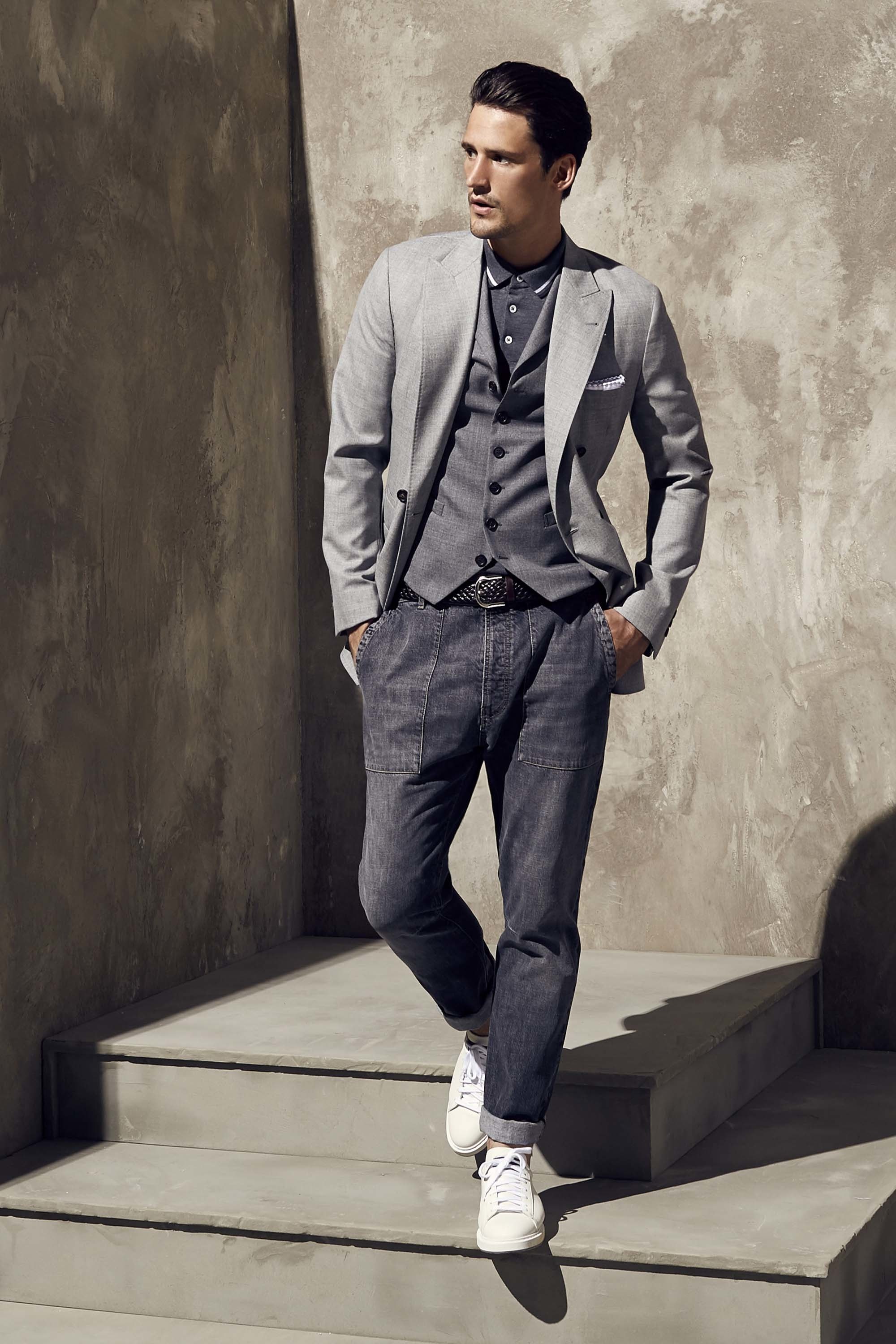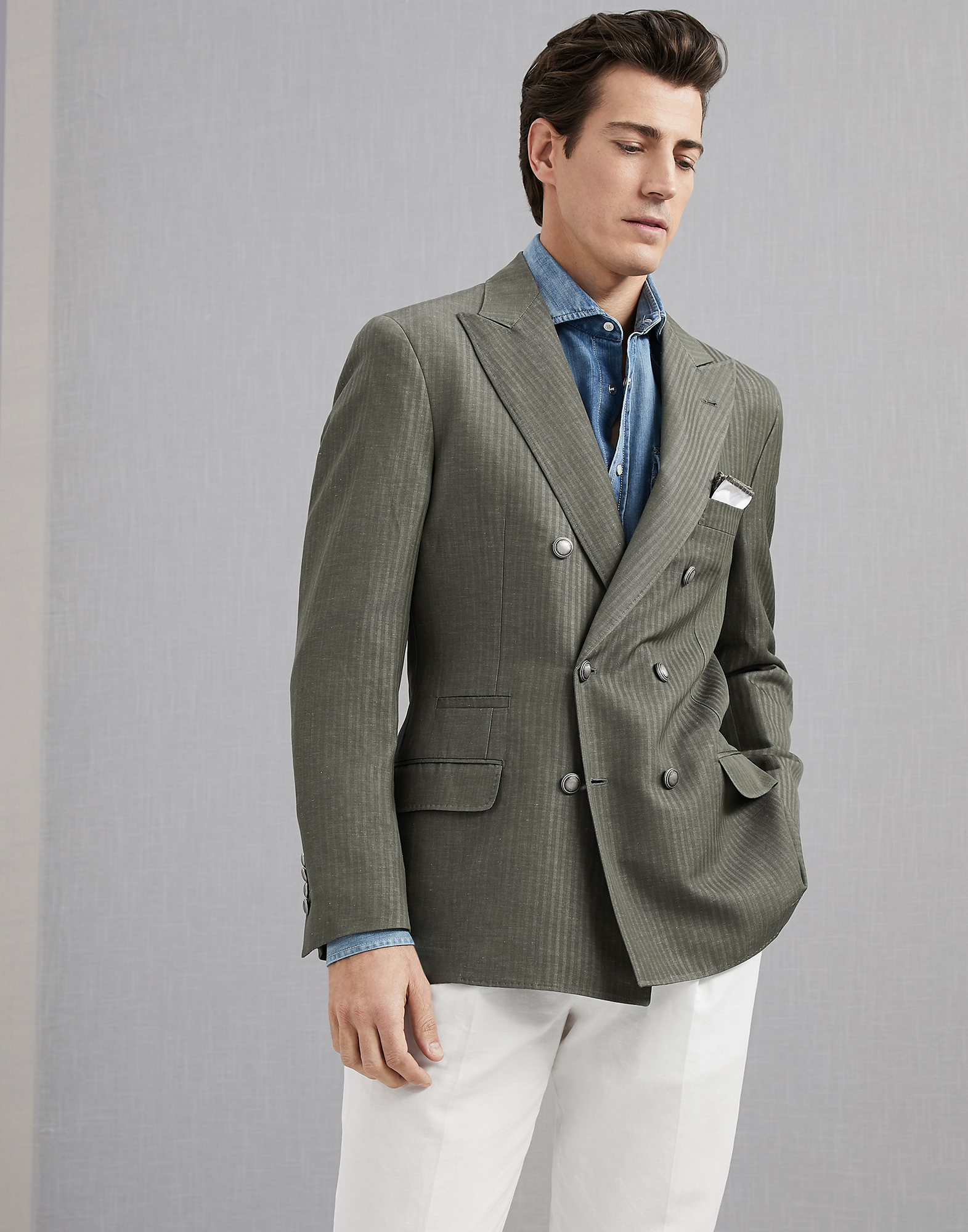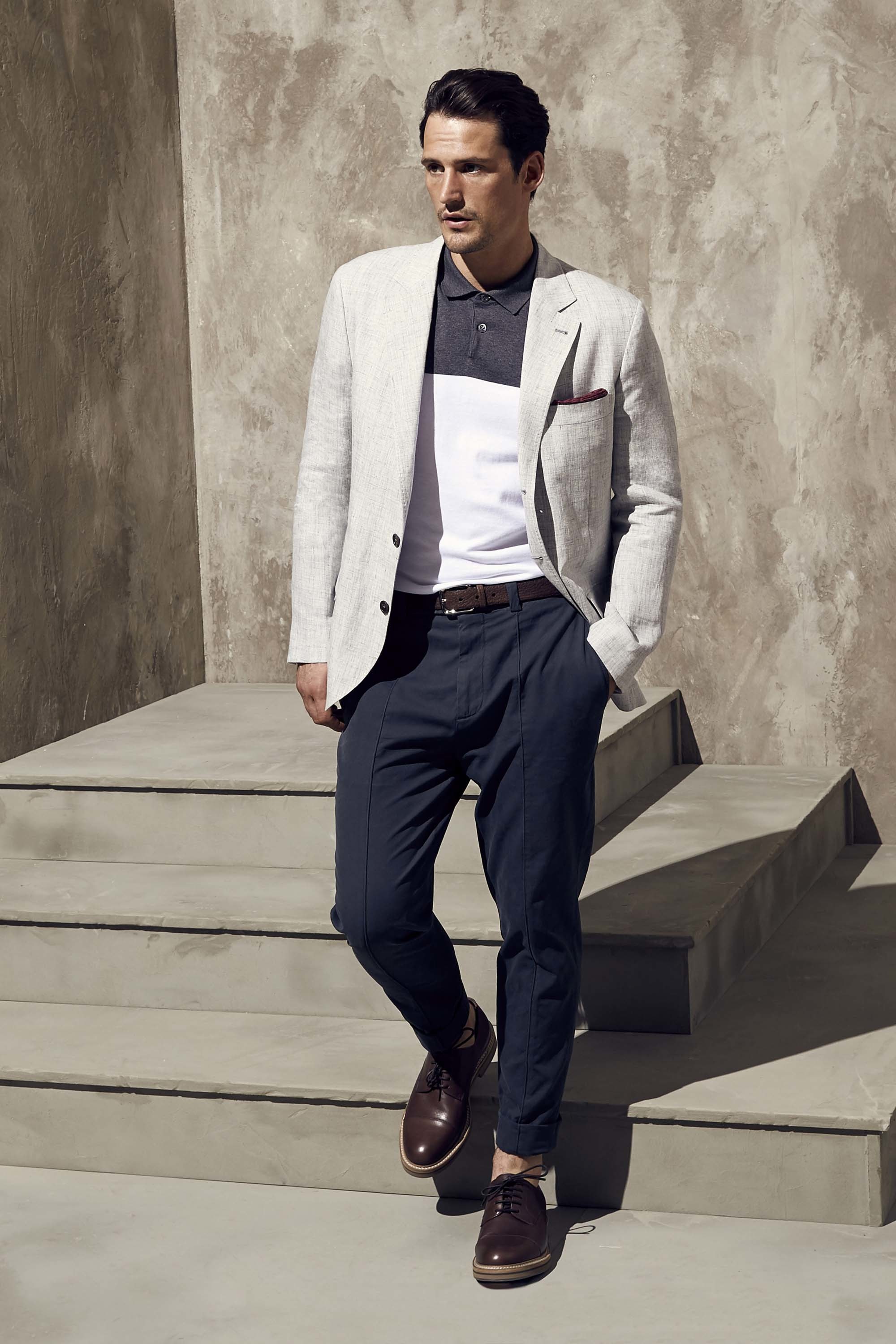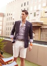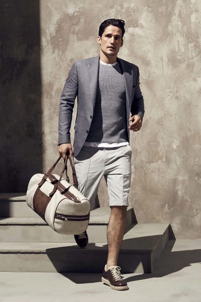 - un completo per l'estate, composto da giacca sartoriale, maglione e pantaloncini chiari;