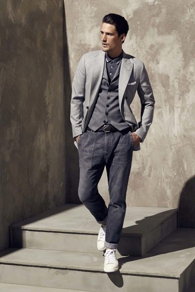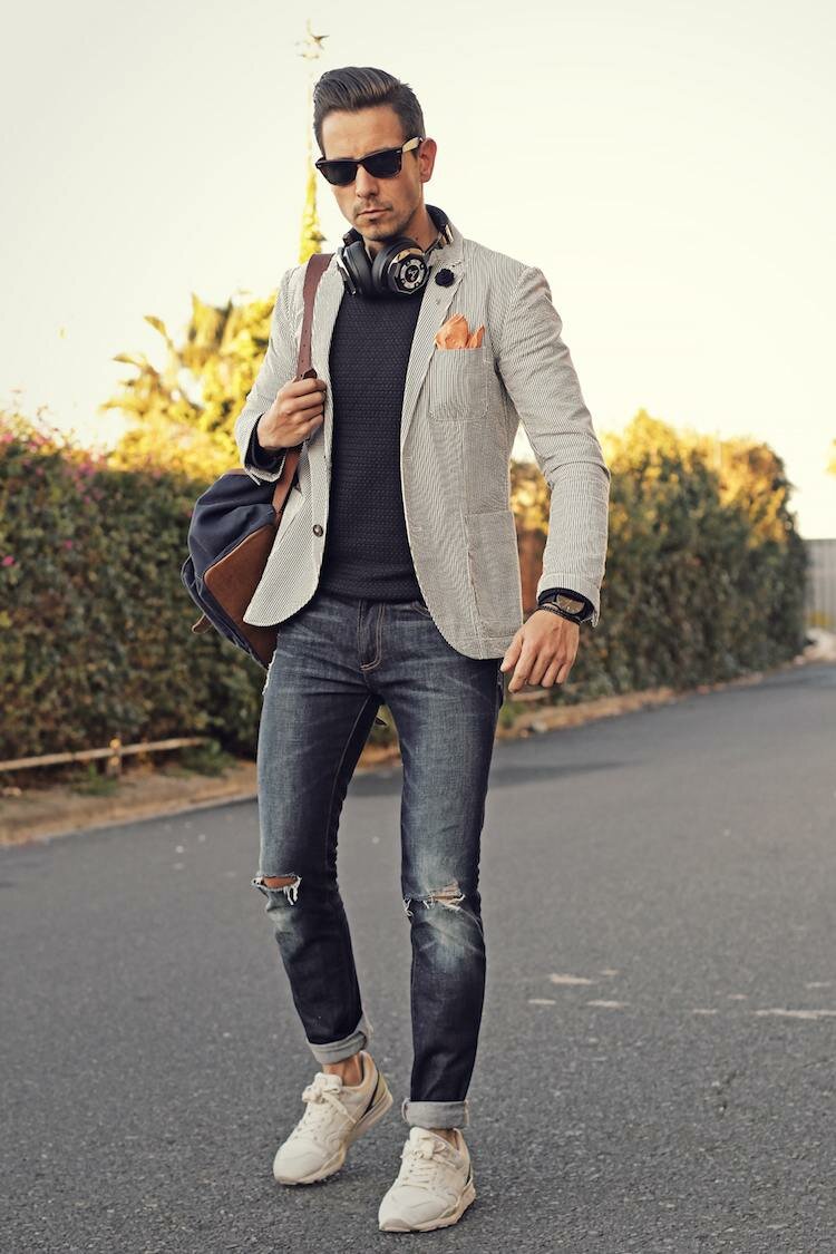 - giacca doppiopetto abbinata a jeans e sneakers;
