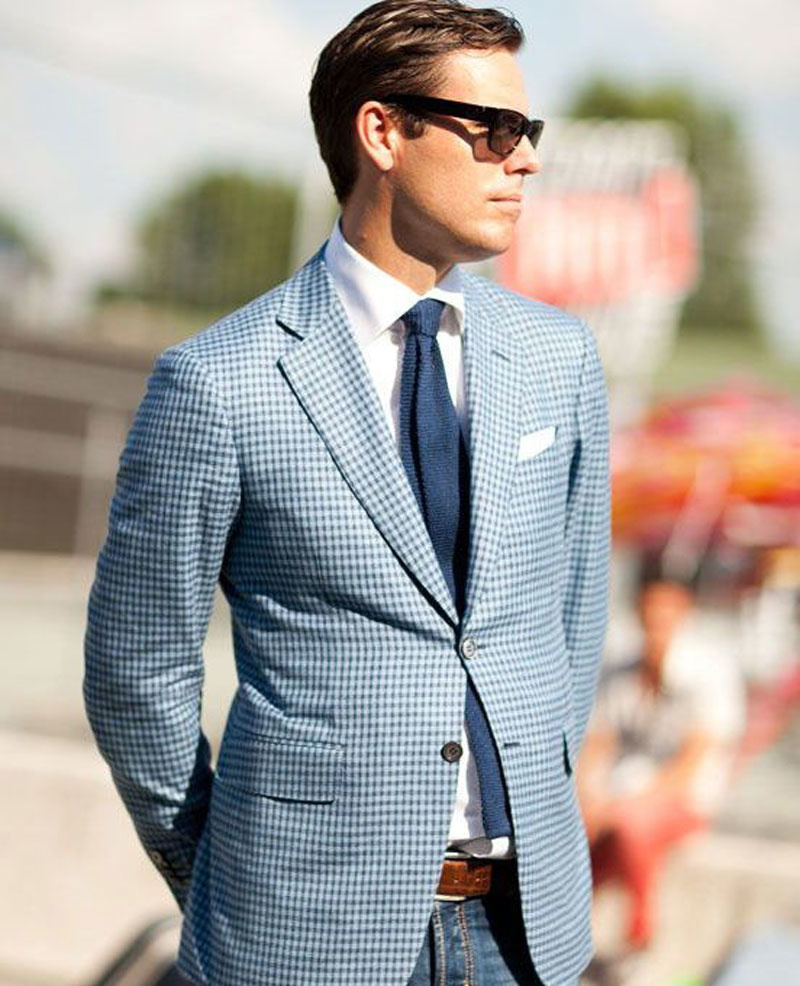 Puoi abbinare un modello in cotone bianco con una camicia azzurra, uno scuro con uno a quadri chiari.