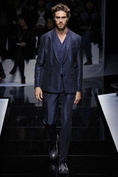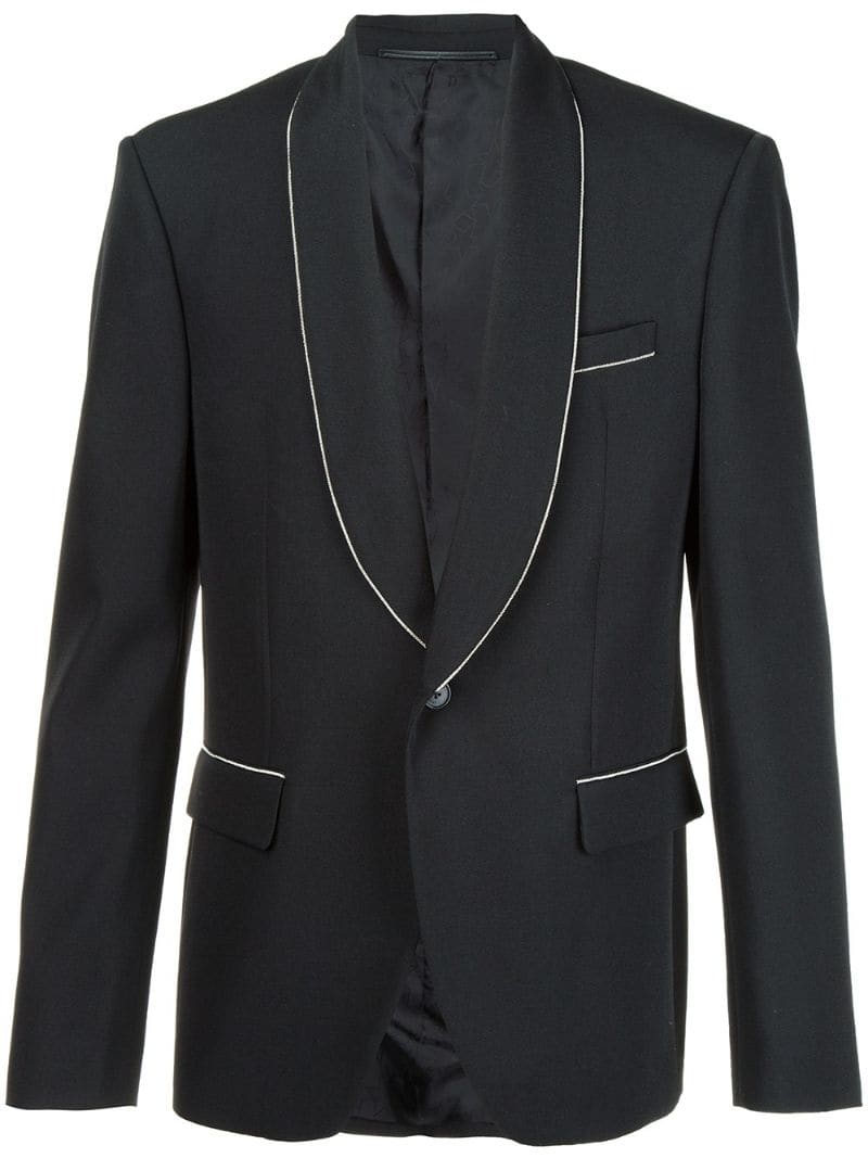 - un completo con giacca doppiopetto, tasche a filetto e collo sciallato;