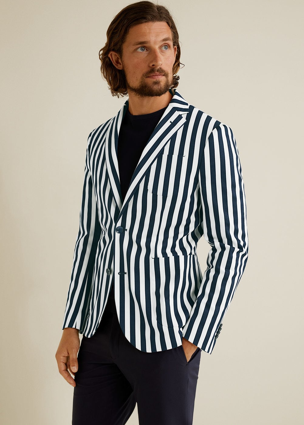 Oggi la tendenza è la striscia: è universale, una giacca del genere si abbina a tante cose del guardaroba... Può essere un accento elegante in una varietà di stili. La dimensione della striscia non dovrebbe essere grande, le tonalità sono neutre (toni bianchi, blu, neri). Le stampe geometriche della stagione possono essere diluite con motivi astratti. Popolare "piede di pollo", rombi.