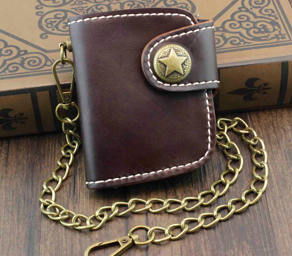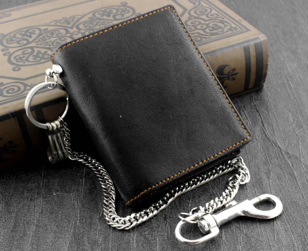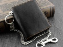 - Verticale con moschettone e catena... Questo attributo del motociclista è indossato nella tasca posteriore. Ha 4 sezioni e un orientamento verticale, si piega come un tablet da viaggio. Questi modelli hanno una clip da cintura a clip, uno speciale portachiavi.