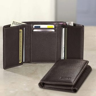- Portafoglio bifold o "bifold". Questa è una versione classica di un portafoglio a doppia piega, compatto e conveniente, che ti consente di posizionare facilmente tutto ciò di cui hai bisogno all'interno: carte, monete, contanti. All'interno può essere presente anche un vano con inserto trasparente per riporre la patente di guida o le fotografie.