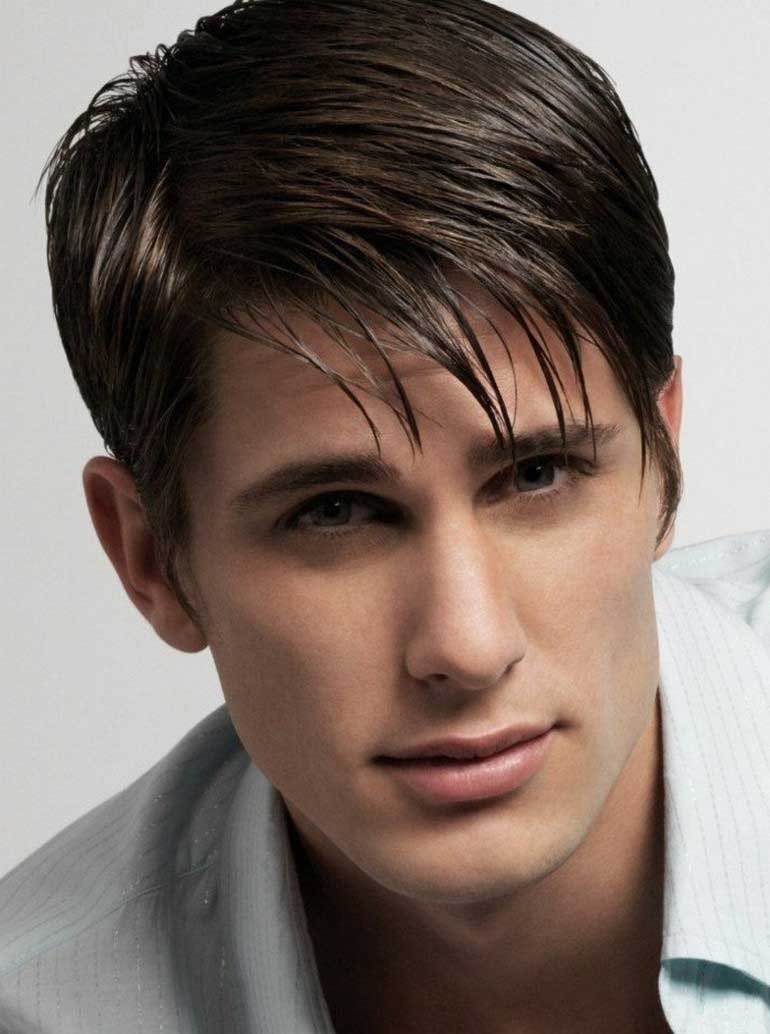 Taglio scalato per capelli medi. L'acconciatura sottolinea la mascolinità e l'efficienza dei ragazzi seri, riflette lo stile aziendale di un giovane uomo d'affari. L'età e la lunghezza del taglio di capelli determinano lo status sociale.