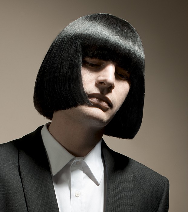 Un taglio di capelli della stessa lunghezza con frangia per capelli lunghi. Un'acconciatura per giovani, versatile, non richiede uno stile complesso. Nella versione maschile, è più una vista spettacolare che quotidiana.