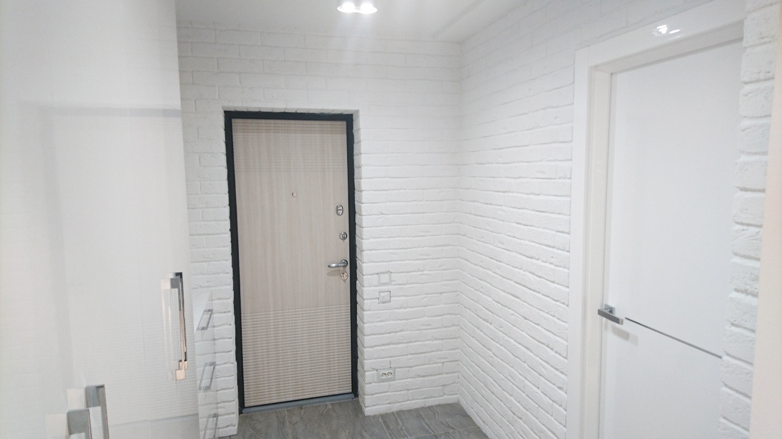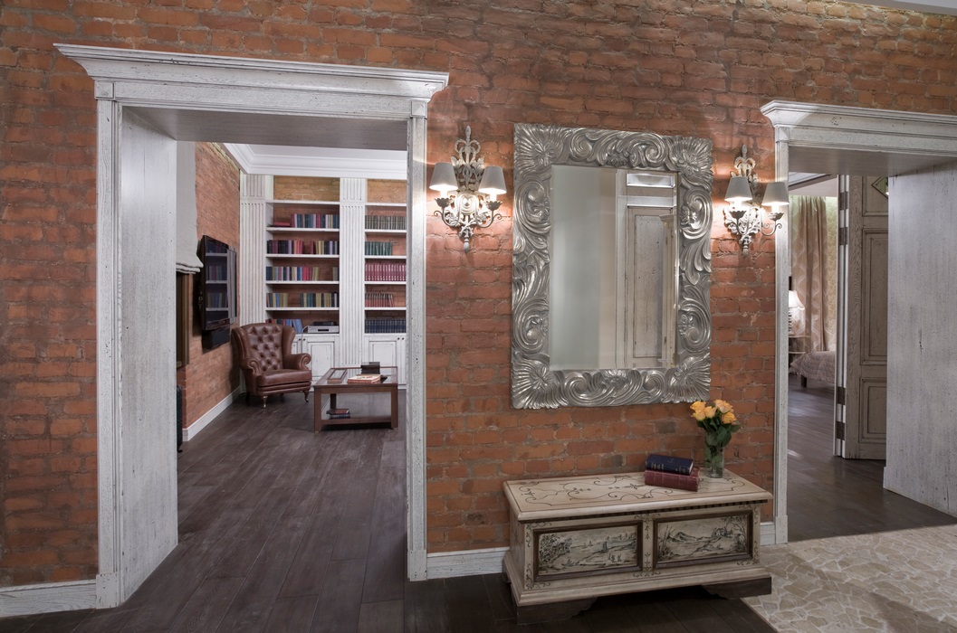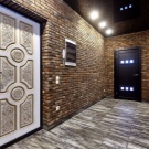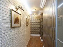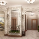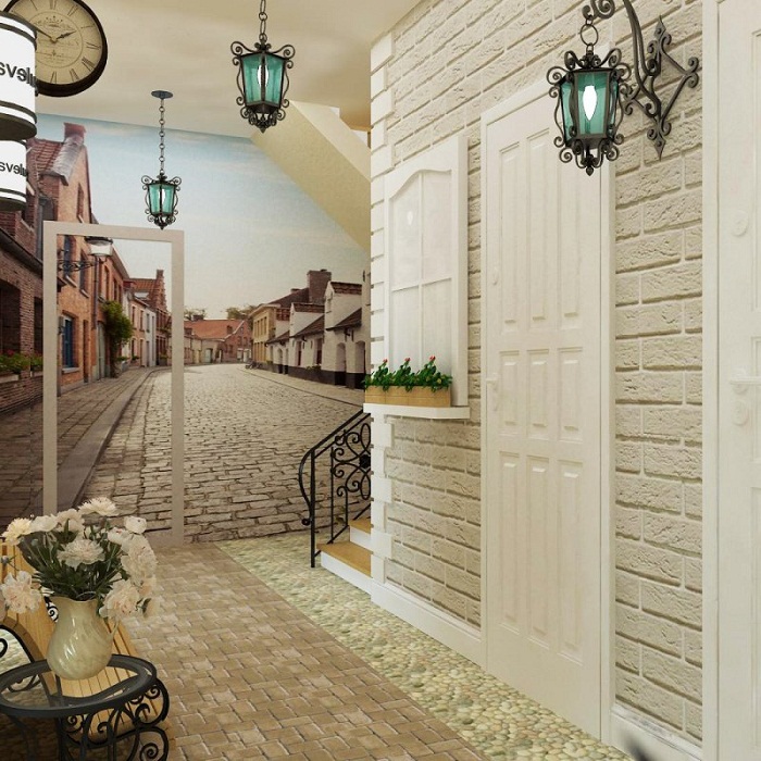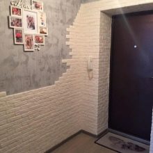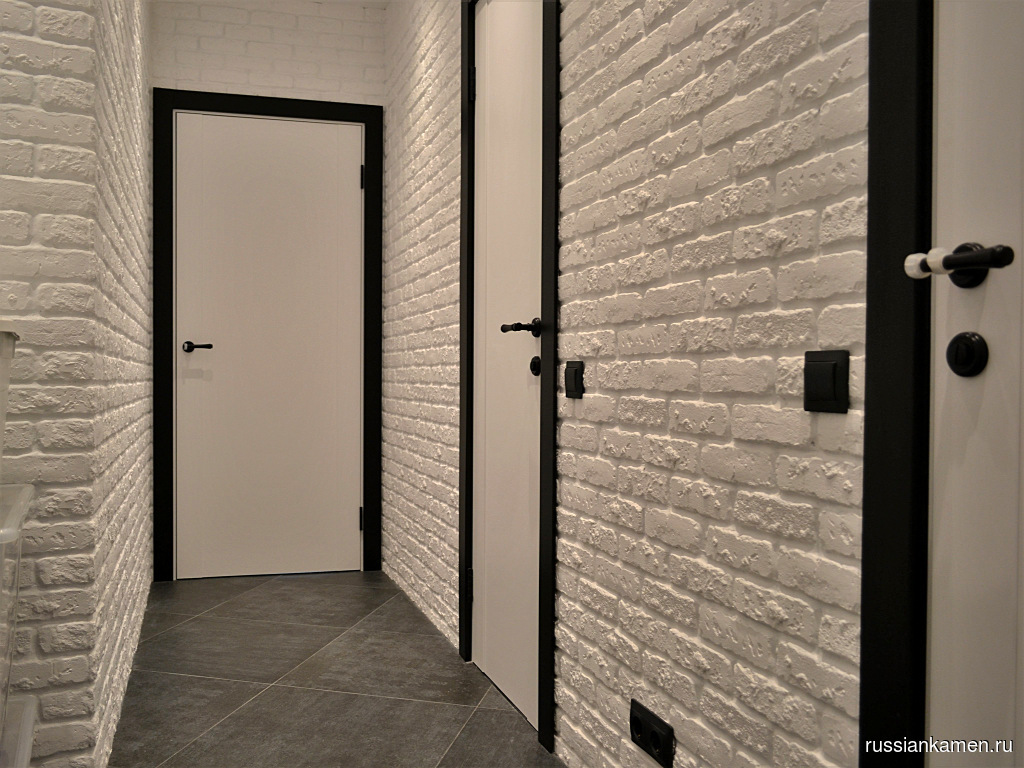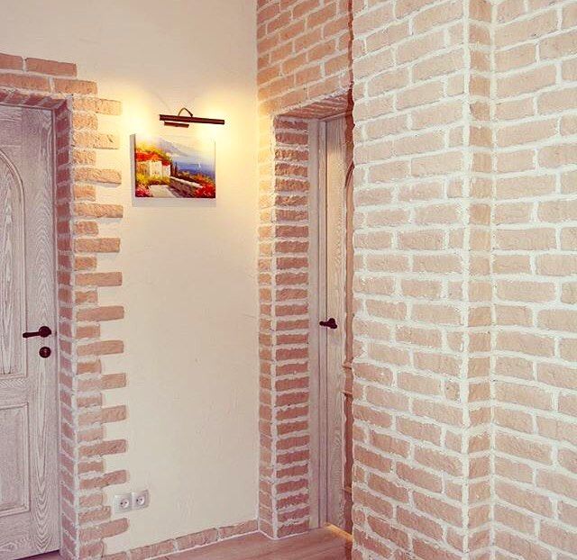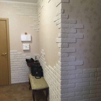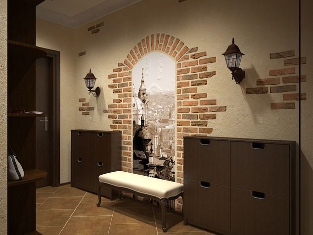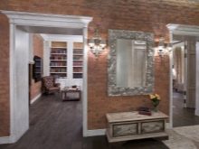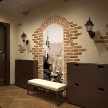 Non solo le superfici delle pareti, ma anche gli archi e le aperture sono rivestiti con finti mattoni nel corridoio. Inoltre, possono essere utilizzati come oggetti interni indipendenti.