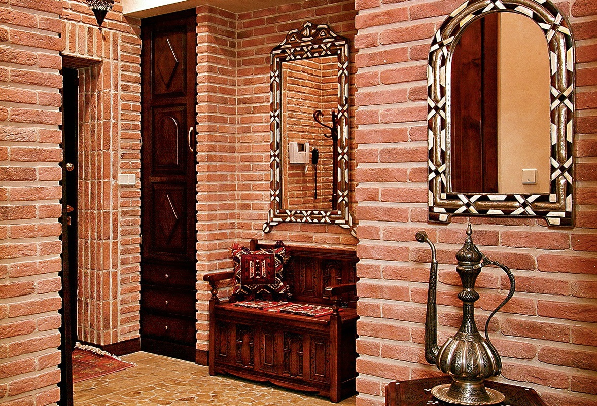 - Un insolito interno del corridoio può essere creato in stile etnico. Questo design combina laconicismo e colori vivaci. Qui il mattone ocra è appropriato, il più delle volte è combinato con inserti in ceramica.