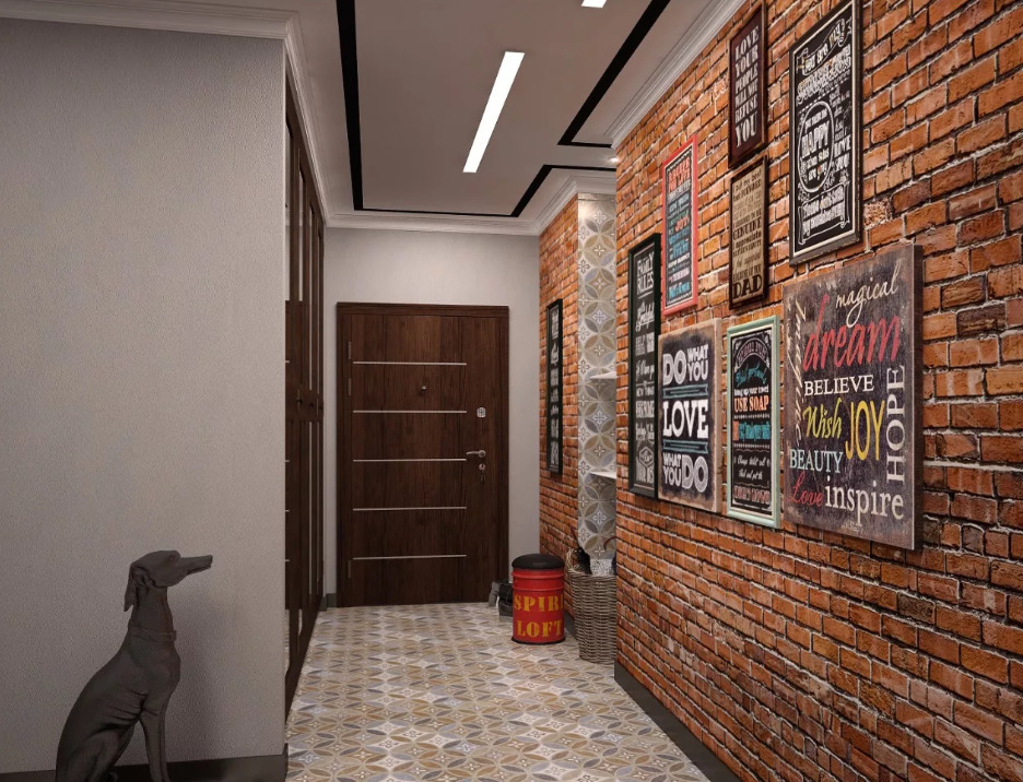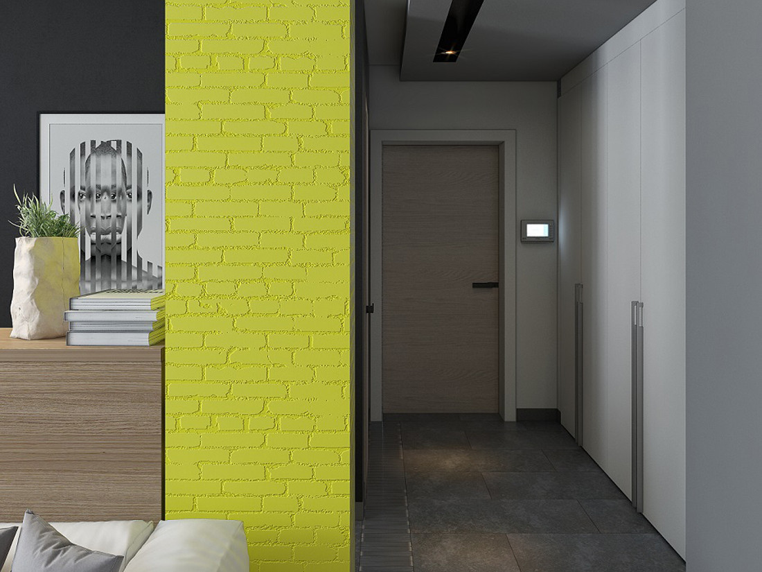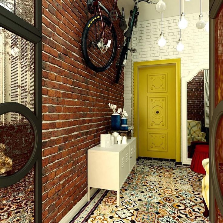 Le finiture in mattoni con colori vivaci sembrano più organiche in ampi corridoi. In piccoli spazi, il materiale viene utilizzato parzialmente per creare accenti su una parete.