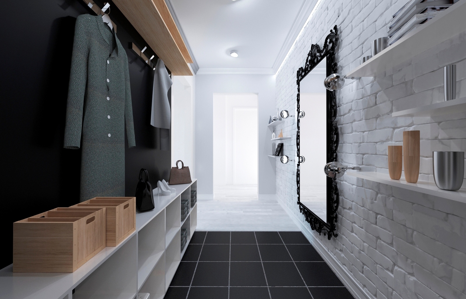 - Stile scandinavo. Uno dei più popolari in questi giorni, la muratura diventa l'accento principale in un tale interno. Qui sono necessarie solo tonalità di luce naturale, i contrasti luminosi in tali interni saranno inappropriati: i pannelli chiari o neri sembrano i migliori. Allo stesso tempo, i mobili che si trovano nel corridoio devono corrispondere perfettamente al colore del mattone e formare con esso un'unica composizione. Un paio di dipinti o un fiore vivente aiuteranno ad appianare la gravità dell'interno.