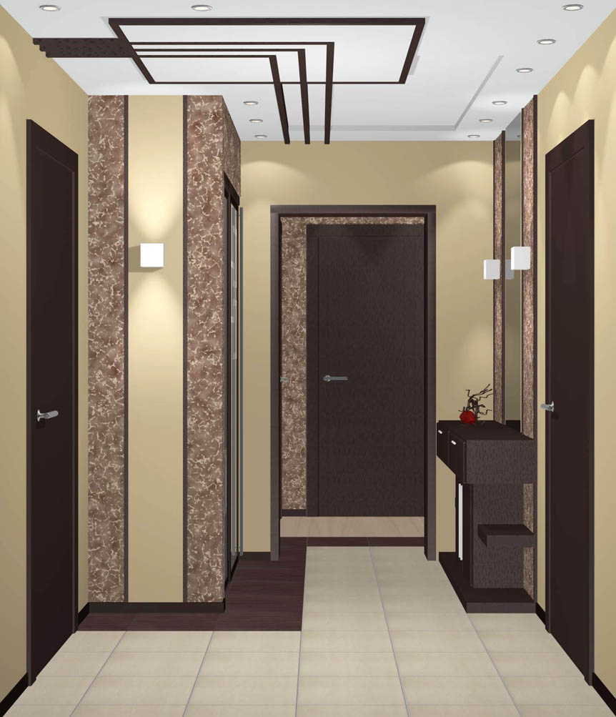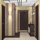 La scelta del colore è determinata dall'altezza dei soffitti: più alto è, più scura è la tonalità che può essere applicata... Ad esempio, con motivo beige - marrone o con grigio - nero. Il nero sta bene con qualsiasi altro colore. Il marrone morbido e caldo è ideale in combinazione con materiali naturali come legno o pannelli di pietra. Usando i toni scuri nel design del corridoio, dovrai illuminare la stanza per evitare l'effetto di oscurità e oscurità.