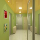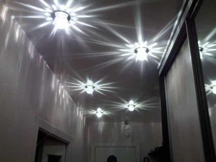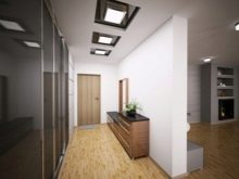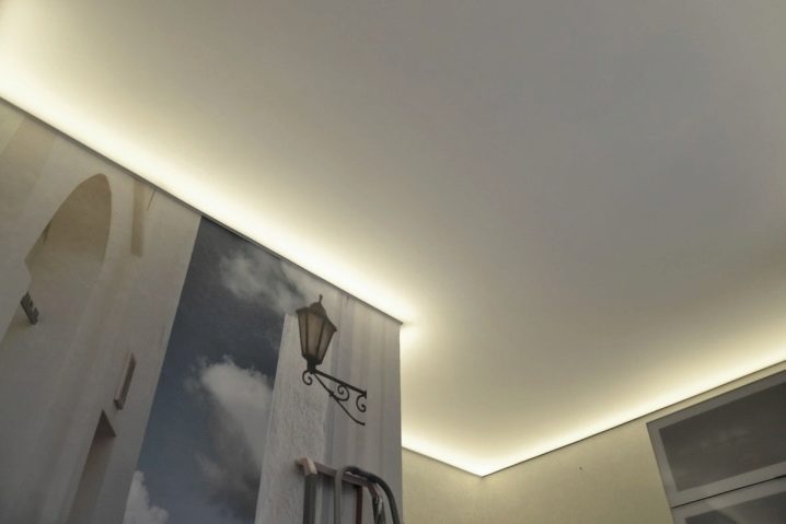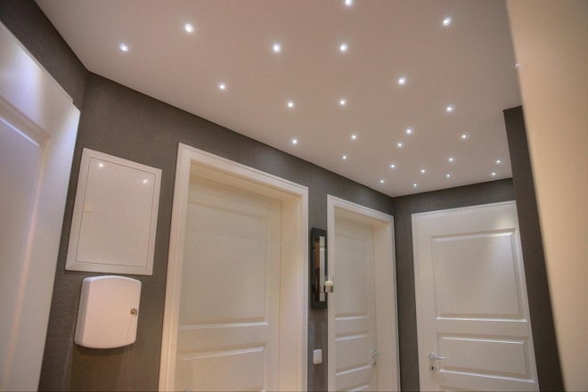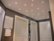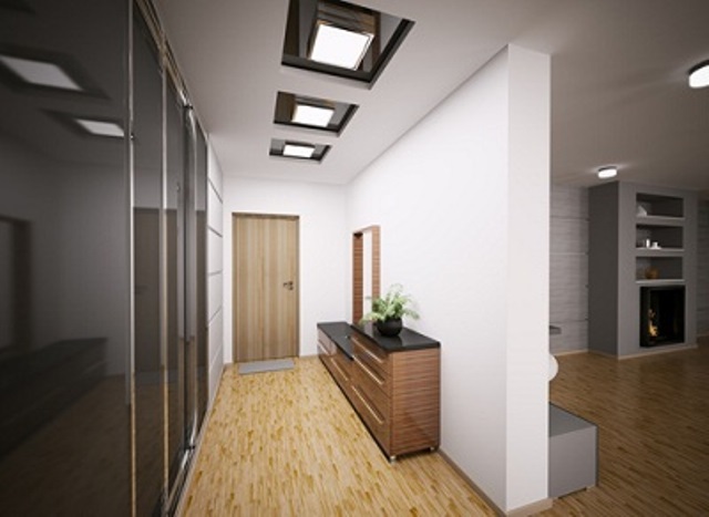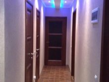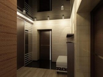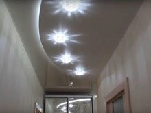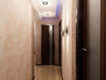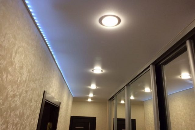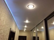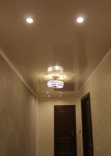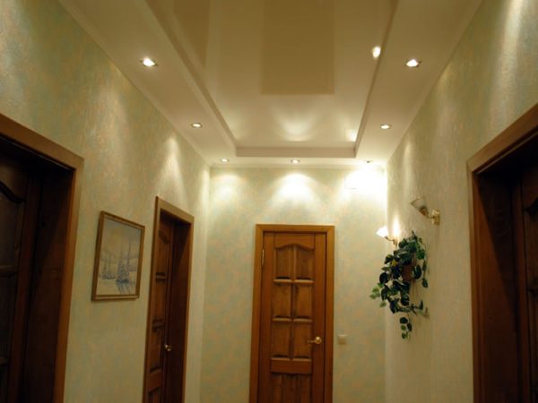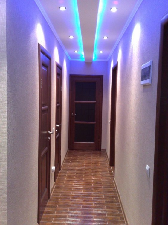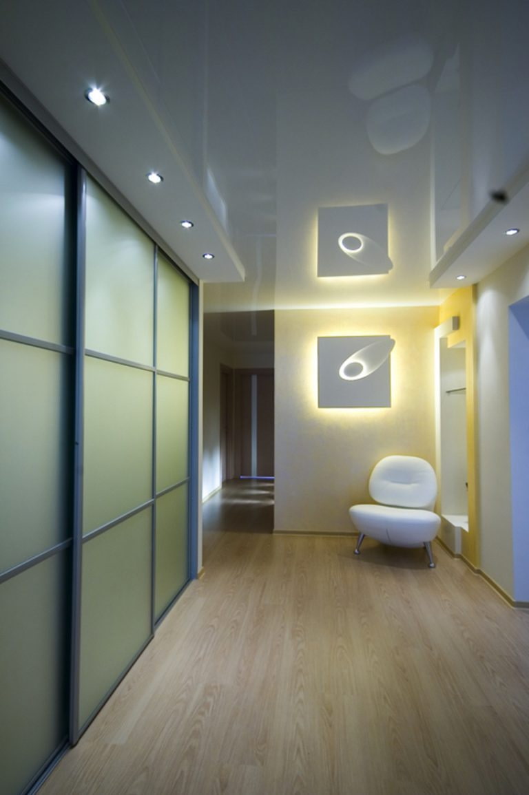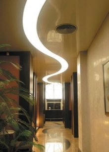 - Se non si desidera installare lampade o lampadari evidenti, soffitto teso luminoso, con strisce LED posizionate sopra la tela, formando varie configurazioni, è una via d'uscita efficace. Un tale elemento di arredo aggiungerà originalità al design del corridoio.