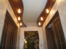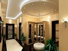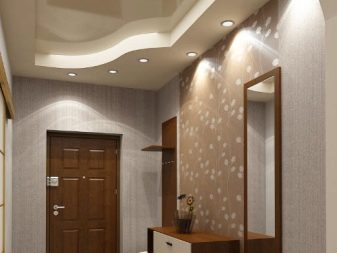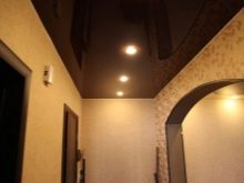 Se il soffitto nel corridoio completa semplicemente il bellissimo interno, non dovresti concentrarti su di esso, lo farà una configurazione a un colore e a un livello. In stanze grandi, una finitura opaca è una buona soluzione. In quelli più modesti, una tela lucida o specchiata aiuterà a creare l'illusione di spaziosità. Se l'interno nel corridoio è poco appariscente, puoi concentrarti sul soffitto scegliendo un materiale elasticizzato a due livelli, galleggiante o con un interessante materiale elasticizzato per la stampa fotografica.