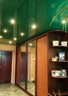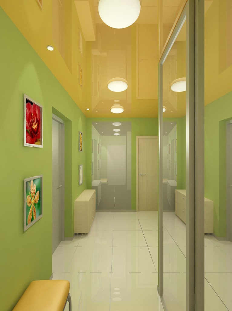 La combinazione di colori del soffitto teso dovrebbe essere in armonia con il colore delle pareti e del pavimento, nonché con i mobili nel corridoio. Per un corridoio stretto e corto, la scelta migliore è un soffitto con un tono chiaro o con un motivo di toni più scuri nel mezzo.