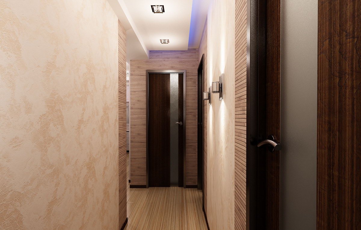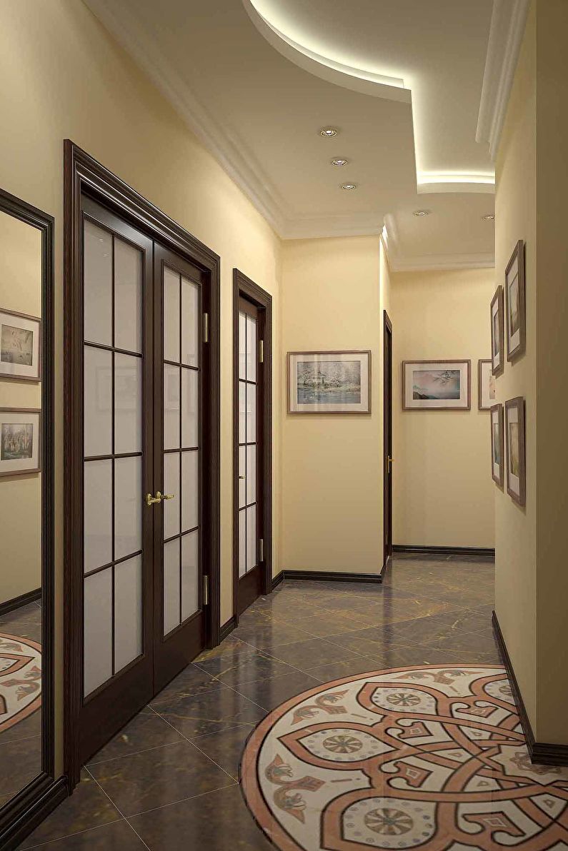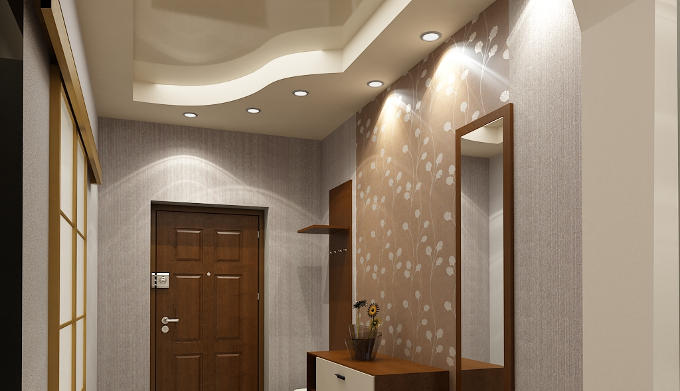 In molti appartamenti, il corridoio ha la forma di un rettangolo allungato. Una stanza così stretta e lunga renderà visivamente più ampi i motivi trasversali sul soffitto teso. L'uso di tonalità chiare e un'illuminazione competente aiuterà ad aumentare visivamente il volume della stanza.