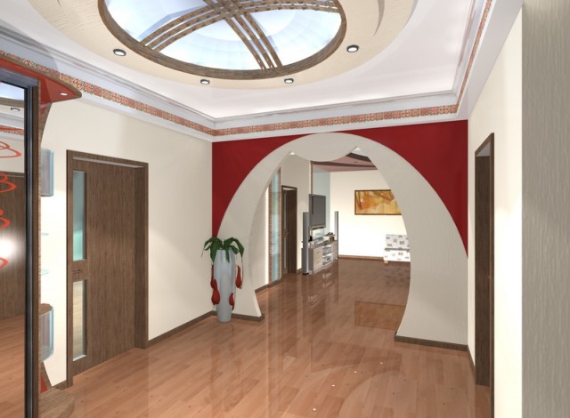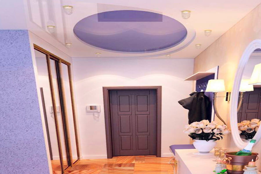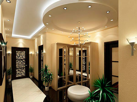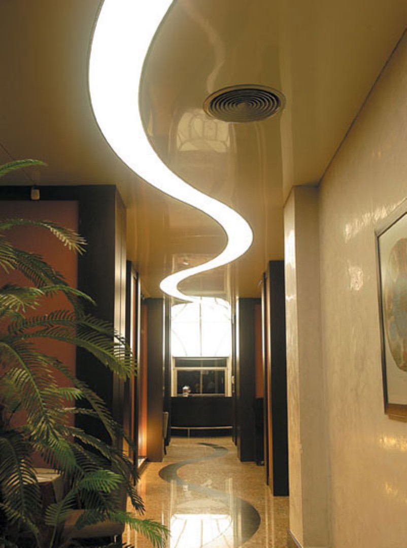 - Soffitto teso a specchio lungo l'intero perimetro del corridoio o in una sua parte, l'ovale o il cerchio specchiato evidenziato creerà un insolito effetto di profondità.