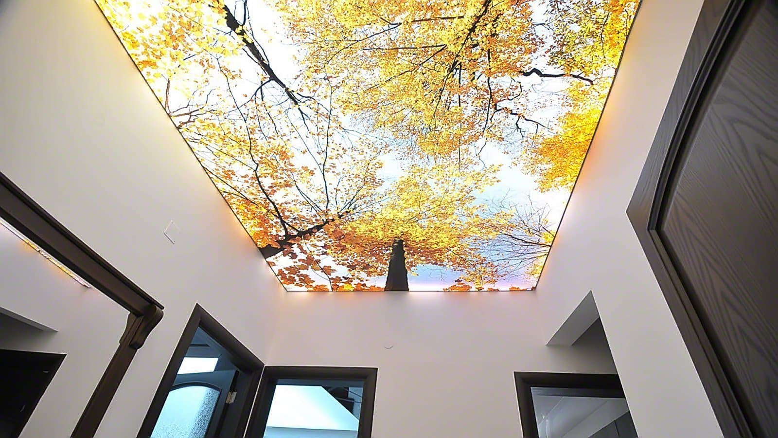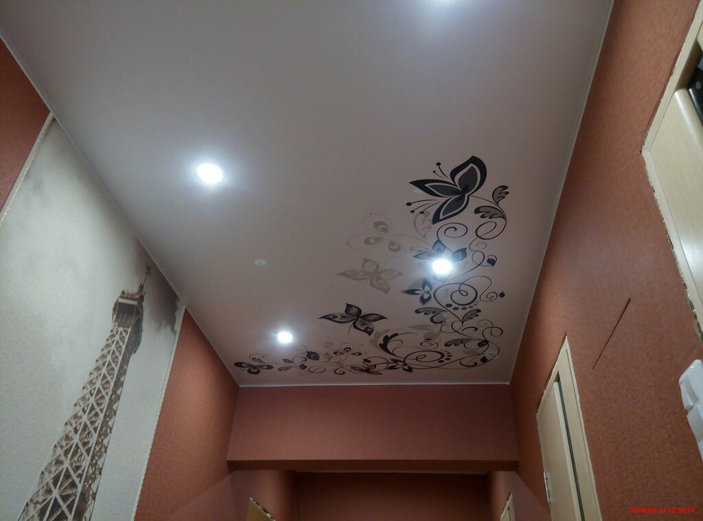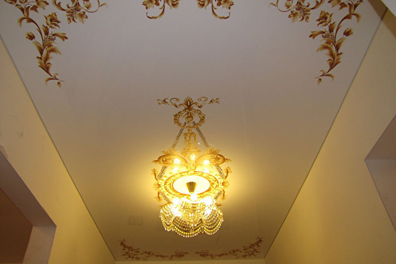 I materiali moderni ti consentono di incarnare le idee coloristiche più audaci. Ad esempio, la stampa fotografica è un elemento luminoso e insolito per il soffitto nel corridoio. La stampa fotografica viene applicata a tessuti elastici senza cuciture. Nella banca delle foto, tra un milione di varianti, il cliente sceglie quella che si adatta ai suoi gusti, il disegno viene trasferito sulla tela del soffitto. Esistono tre tipi di stampa: