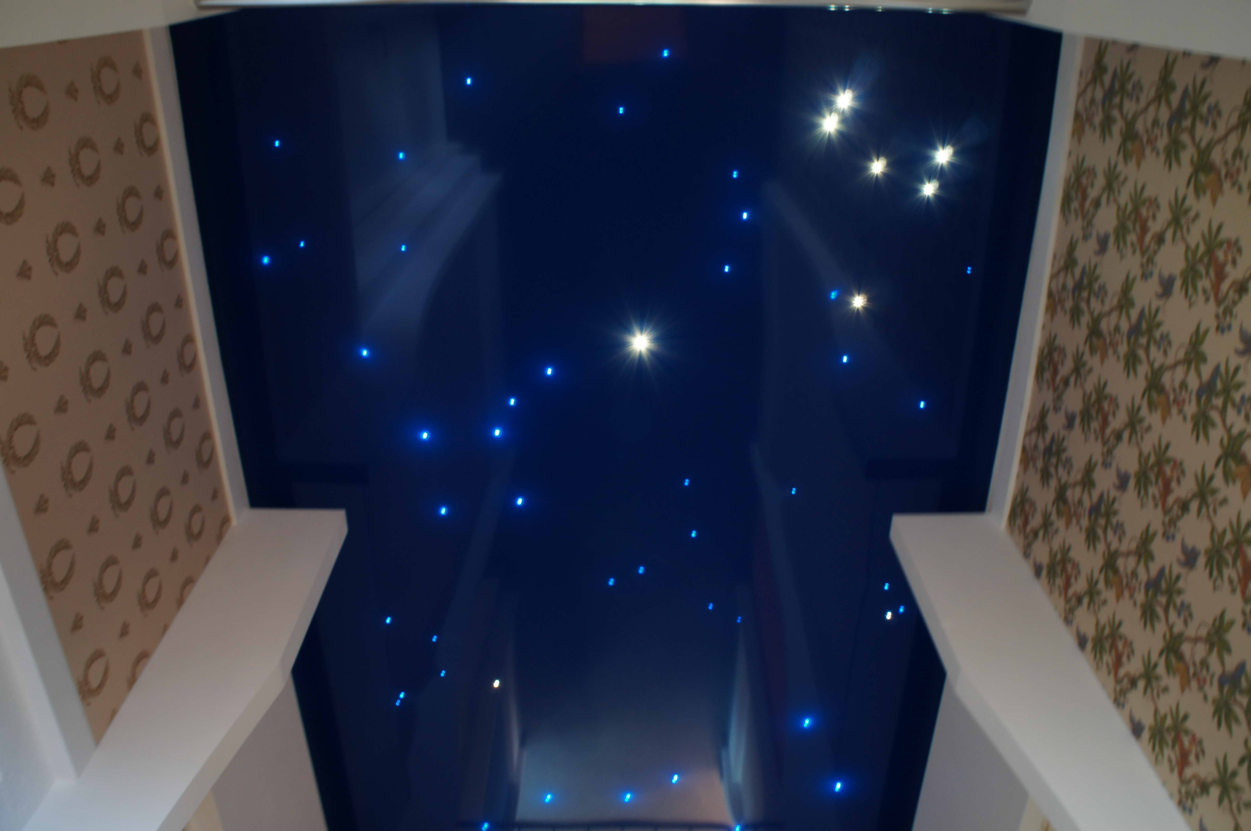 - Idea interessante - soffitto che riproduce il cielo stellato... Per un tale design, è meglio scegliere un panno in tessuto, la retroilluminazione è installata senza danneggiare il materiale.