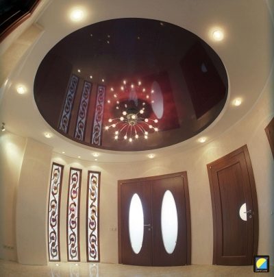 Un sorprendente elemento decorativo che ti consente di regolare la forma della stanza, di suddividerla in zone. Usando materiali che differiscono per colore e consistenza, puoi creare una struttura unica che attira l'attenzione. Puoi aumentare visivamente il soffitto se metti un ovale di tela scura all'interno della base chiara.