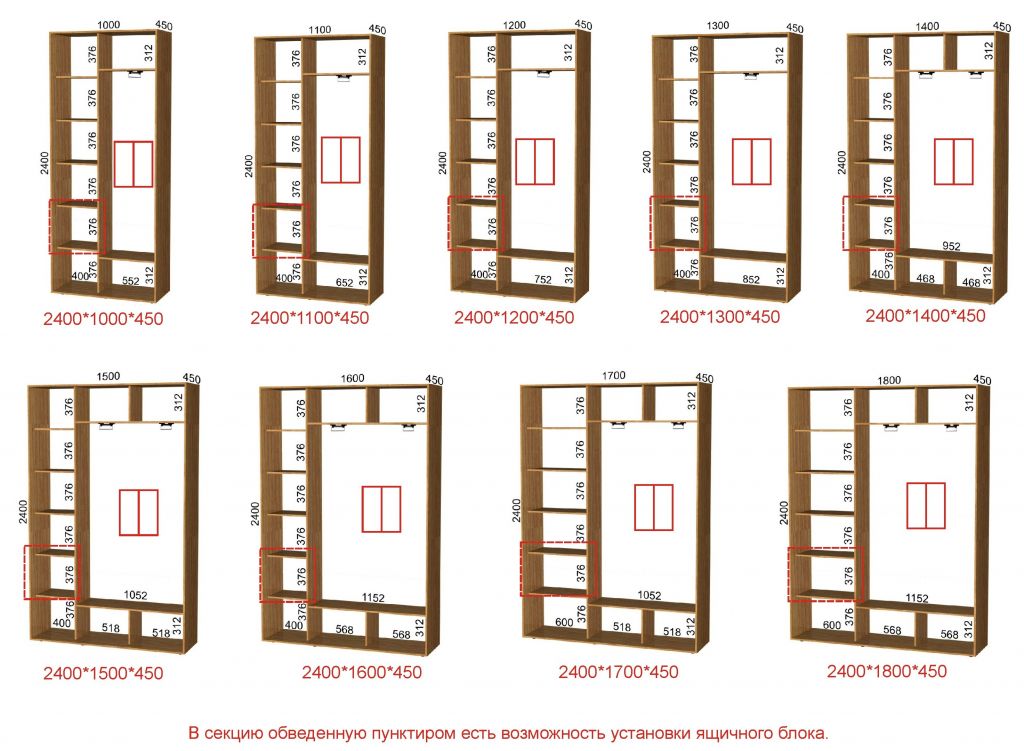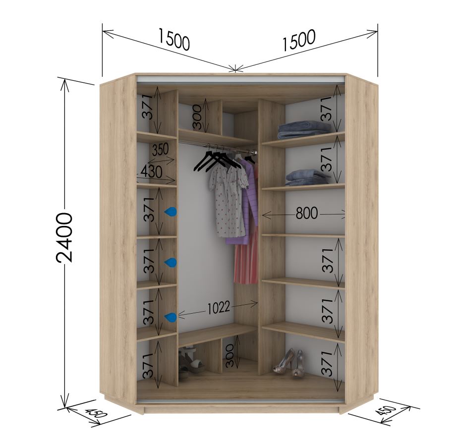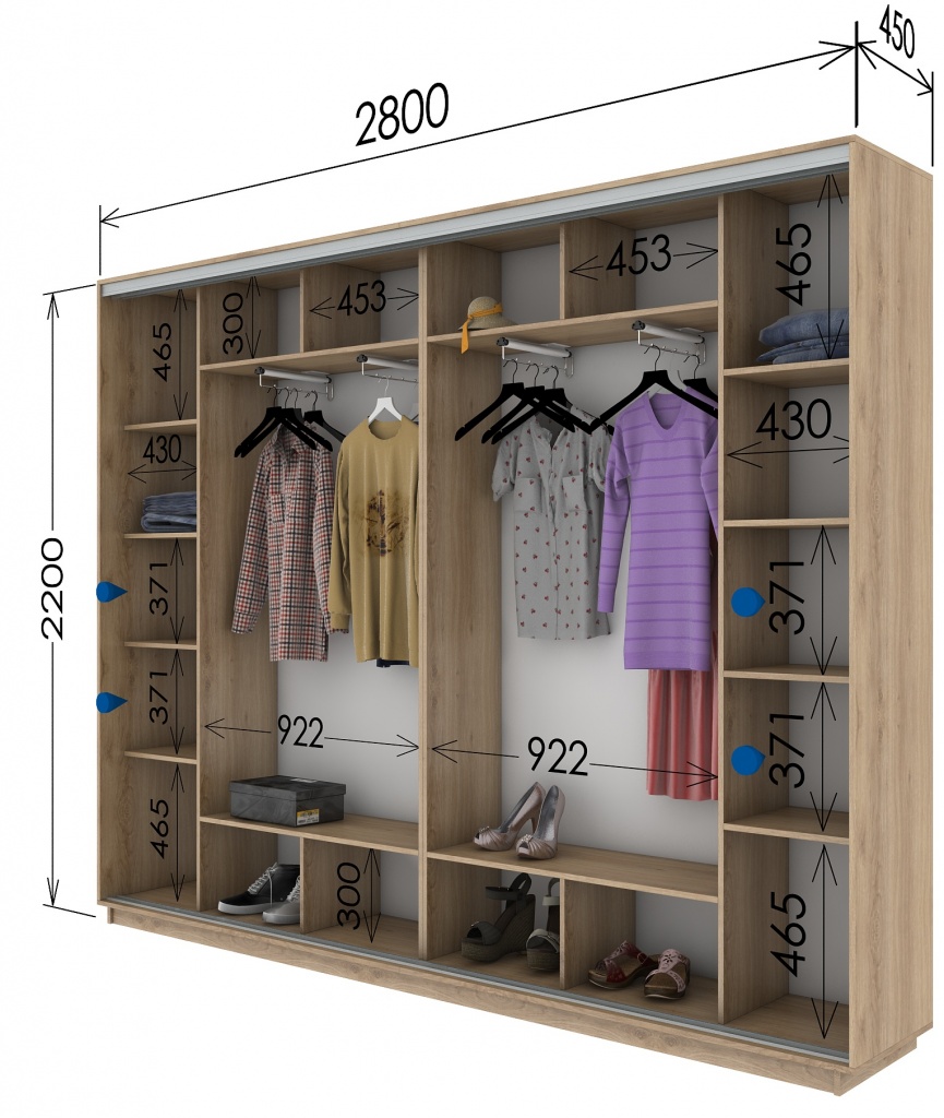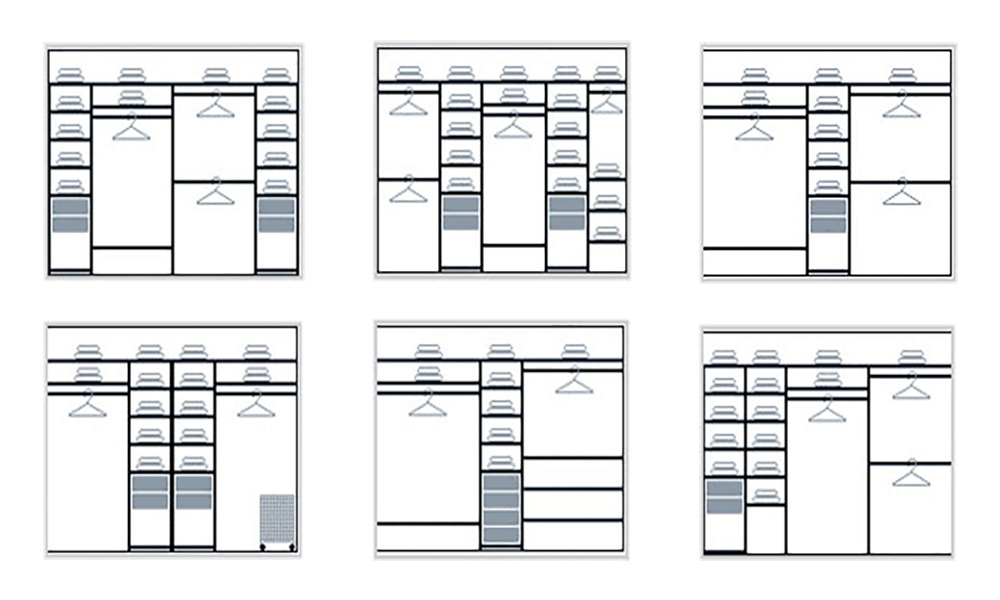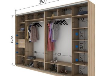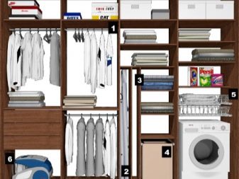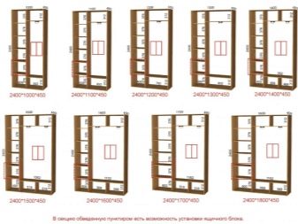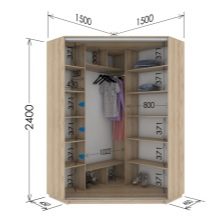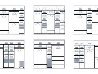 Analizziamo diversi esempi di successo della posizione delle sezioni in un guardaroba moderno e confortevole con l'indicazione della dimensione.
