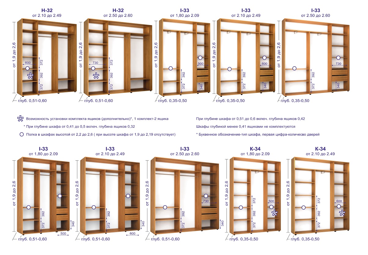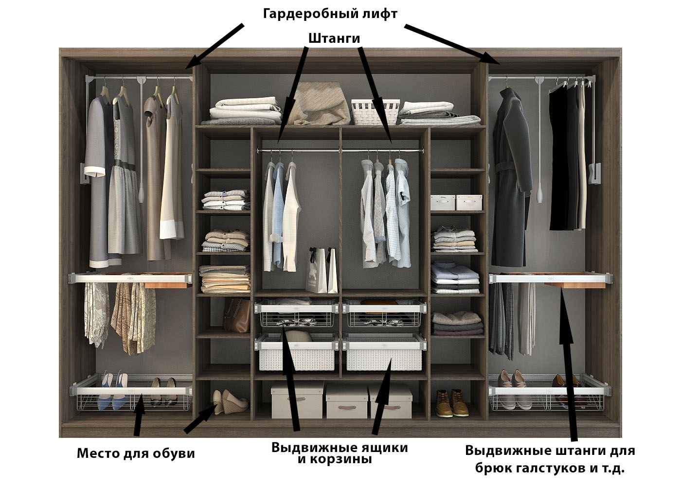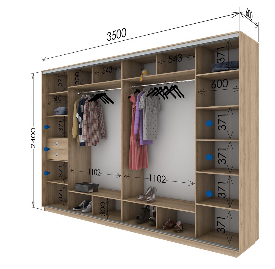 Analizziamo diversi esempi di successo della posizione delle sezioni in un guardaroba moderno e confortevole con l'indicazione della dimensione.