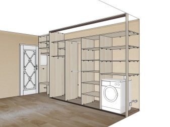 Se gli scomparti per le grucce sono abbastanza spaziosi, puoi anche inserire una lavatrice o un aspirapolvere. Tutti nello stesso vano centrale sono presenti ganci per borse, pacchi, ombrelli. A lato del vano centrale sono presenti ripiani di diverse dimensioni. La loro altezza è di 30 cm, larghezza - da 80-90 cm.Sebbene per piccoli corridoi, sono possibili anche ripiani larghi 40 cm.