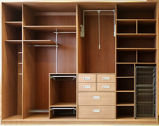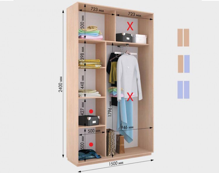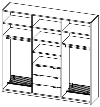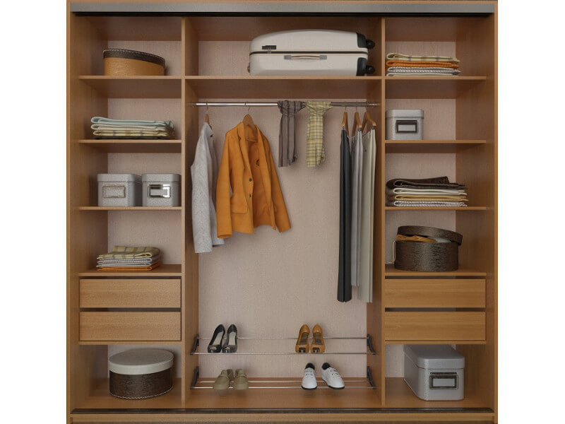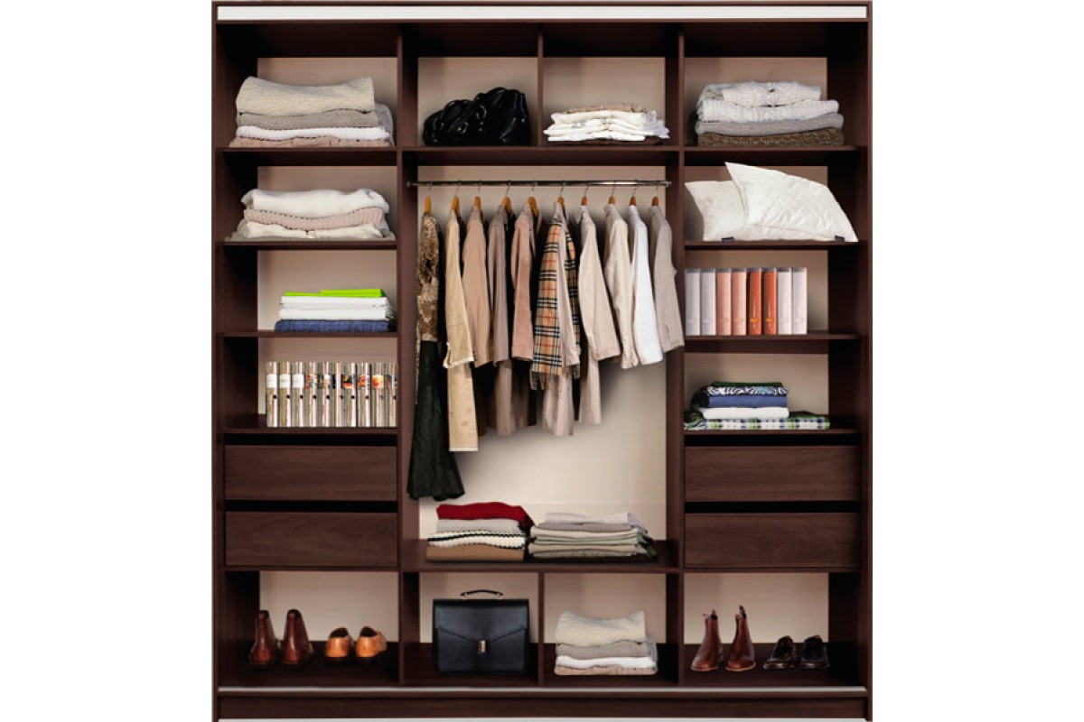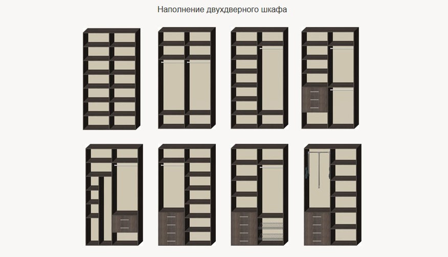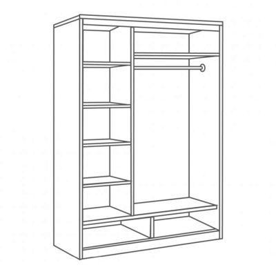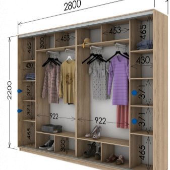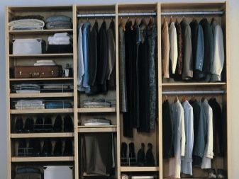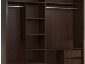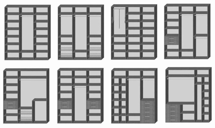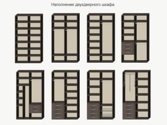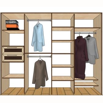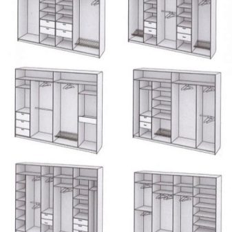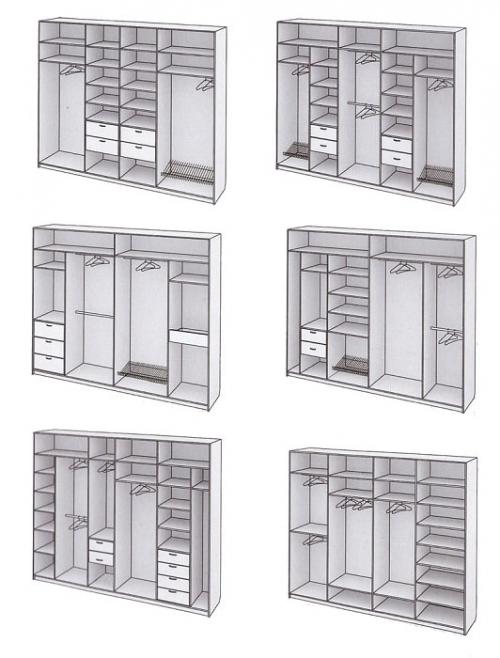 - due scomparti di solito formano un'ampia area per riporre i vestiti su un appendiabiti, lo spazio rimanente è pieno di ripiani;