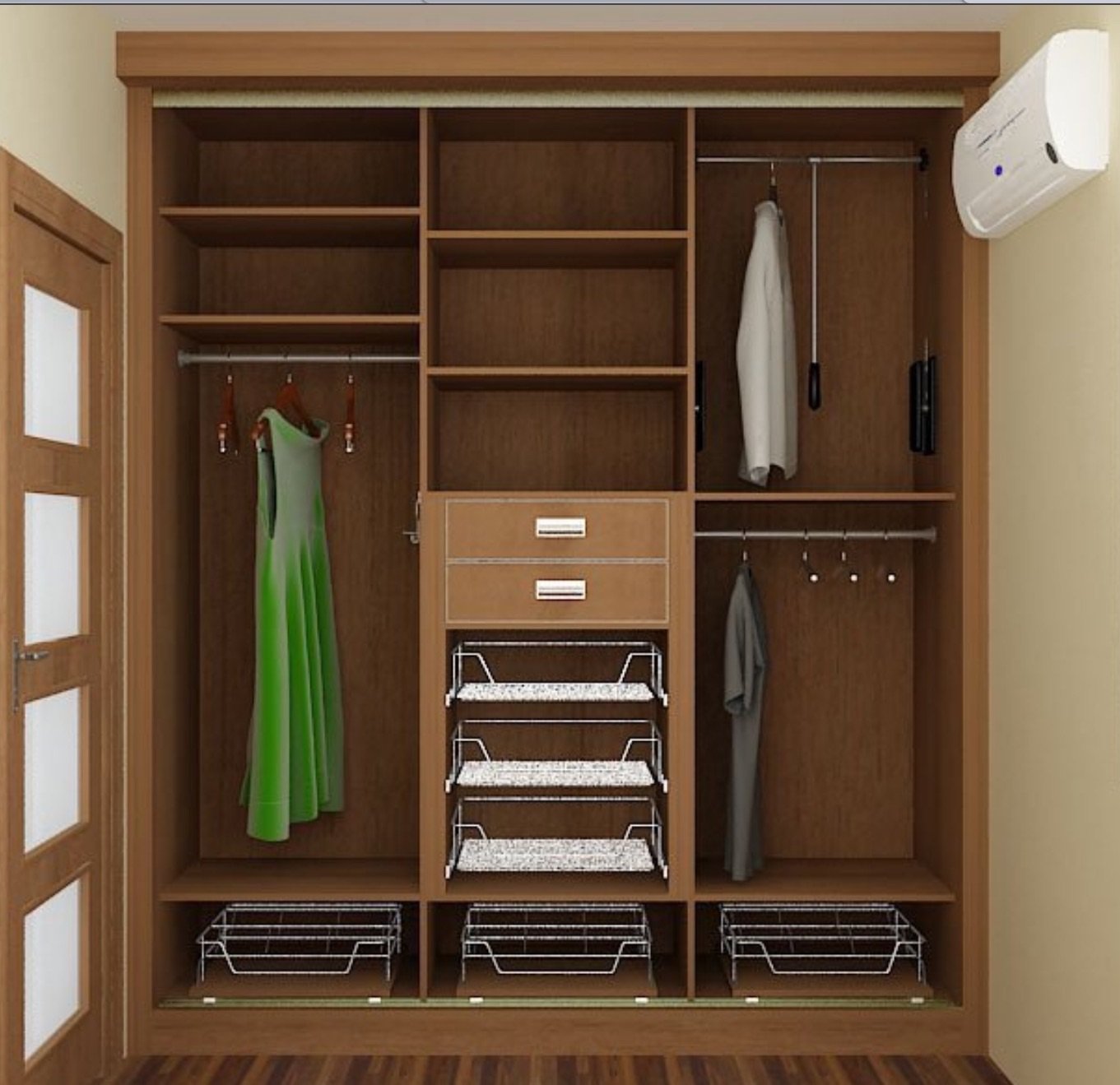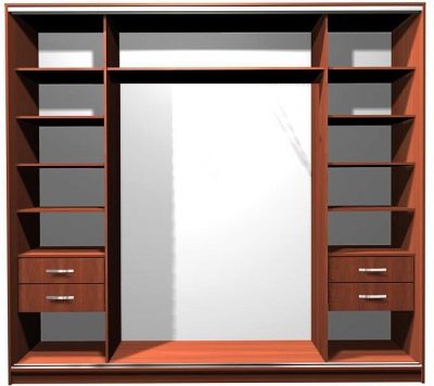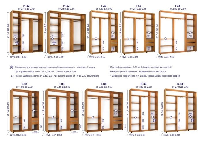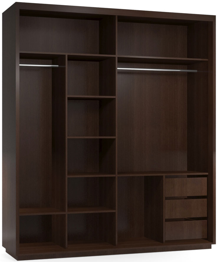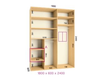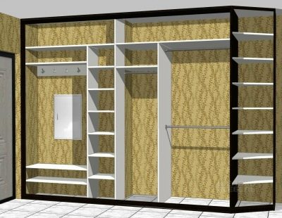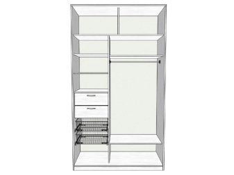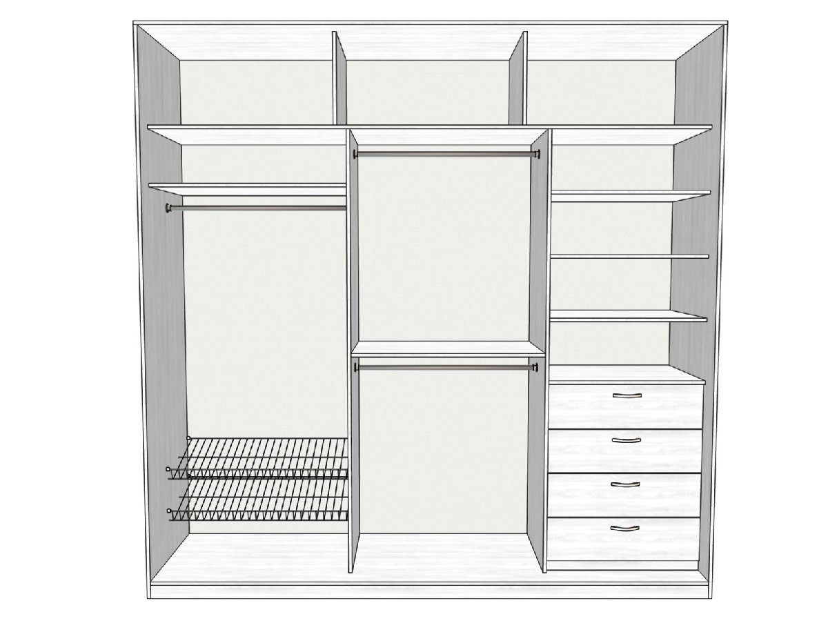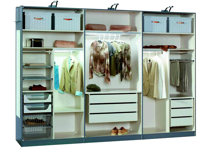 - due scomparti di solito formano un'ampia area per riporre i vestiti su un appendiabiti, lo spazio rimanente è pieno di ripiani;