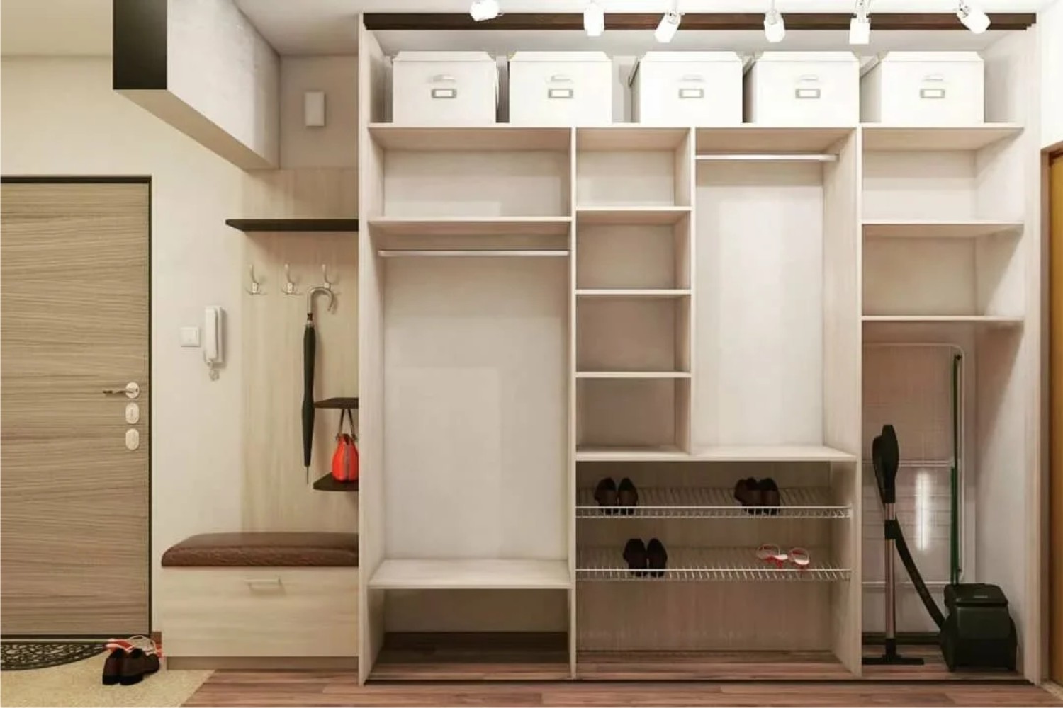 Pensa in anticipo a cosa conserverai nell'armadio nel corridoio e quanto spazio libero sei pronto a dare sotto l'armadio. Fai attenzione ai tuoi calcoli e non rimarrai deluso dal tuo sistema di archiviazione.