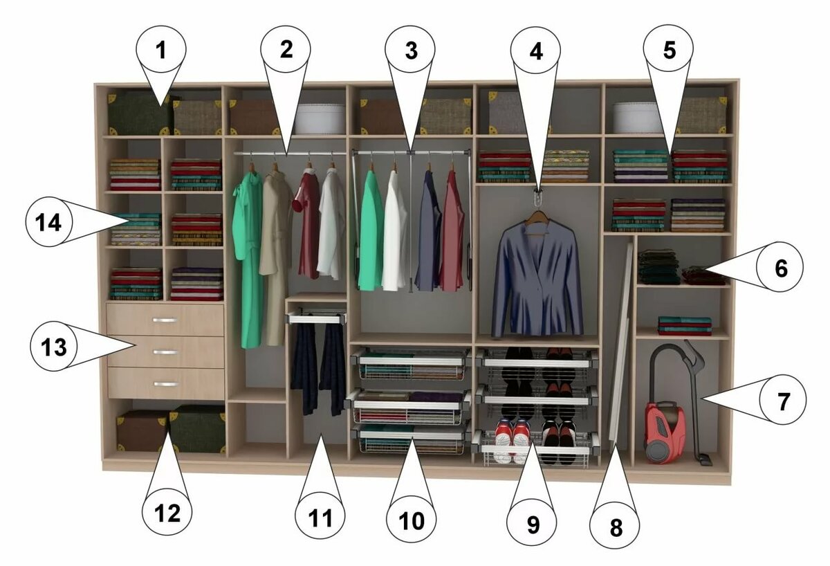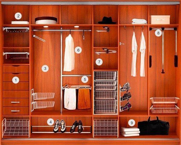 Per quanto riguarda l'organizzazione interna dello spazio, esiste uno schema logico e collaudato per la distribuzione delle cose nell'armadio. Per cominciare, dividi mentalmente l'intero armadio in 3 zone: superiore, centrale, inferiore. Riempi l'interno dell'armadio usando questa divisione.