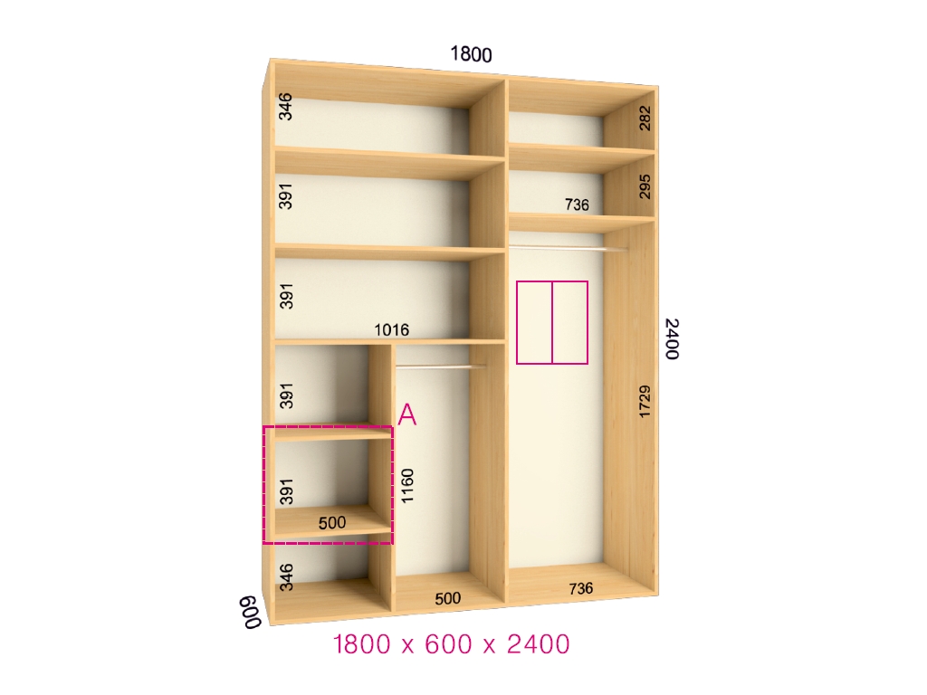 - viene fornito uno scomparto con una larghezza di 50 cm per riporre gli scaffali della maglieria;