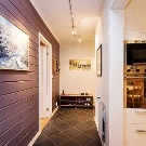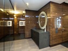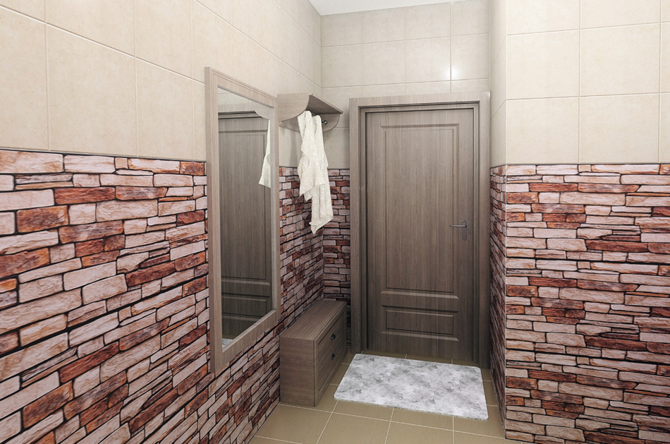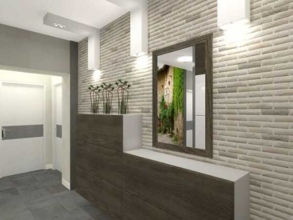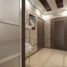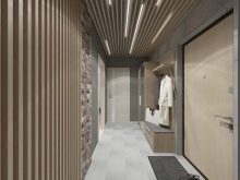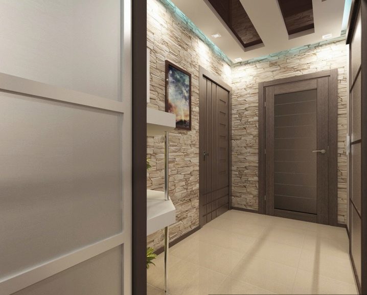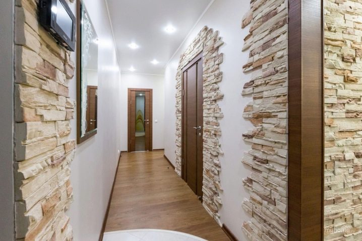 I pannelli che imitano la pietra naturale in diverse tonalità hanno un bell'aspetto sia per decorare completamente le pareti, sia per creare accenti intorno alle porte interne. Di solito non c'è luce naturale nel corridoio e la combinazione di pietra scura con luce artificiale mette sotto pressione chiunque entri in casa. Ciò può essere evitato utilizzando elementi decorativi chiari, specchi e soffitti tesi bianchi con illuminazione e, per rendere la stanza leggermente sporca, il pavimento e le porte sono scelti in tonalità scure.