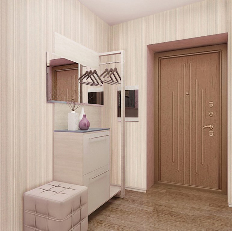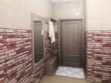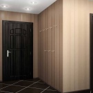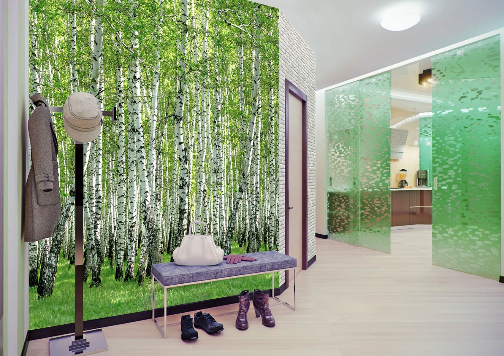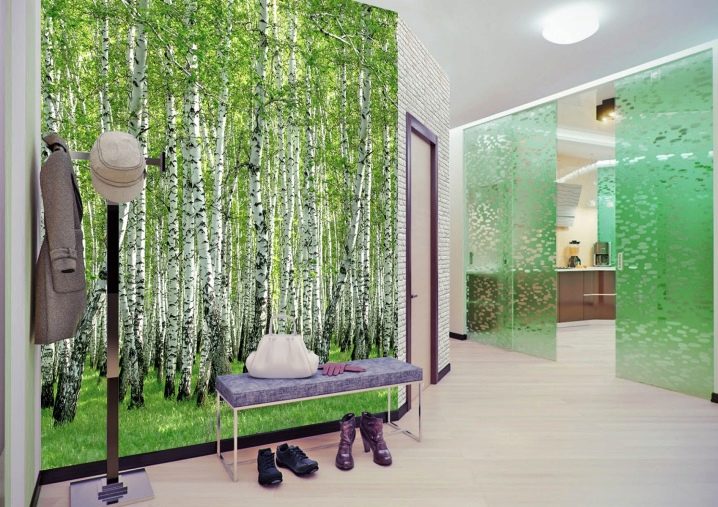 L'aspetto luminoso del corridoio è creato da pannelli ricchi e allegri nei toni del verde chiaro. La persona nella stanza ha una sensazione completa di freschezza e pulizia. I pannelli di plastica rendono la stanza vivace e mandano la persona al suo interno nel boschetto di betulle. Grazie alla nobile tinta bianca del soffitto e delle porte, questa luminosità non sembra invadente.