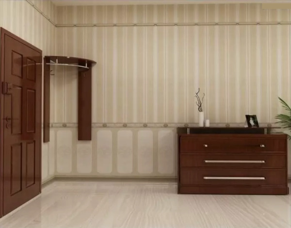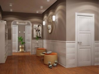 Decorare il corridoio con l'uso di due materiali per pareti contemporaneamente sarà appropriato sia in appartamenti grandi e spaziosi, sia negli stretti corridoi di piccoli appartamenti. La parte inferiore è realizzata in un materiale come l'MDF, mentre la parte superiore è rivestita in plastica. L'imitazione del legno si combina armoniosamente con i mobili del corridoio e il motivo discreto dei pannelli crea un accento luminoso in una stanza poco appariscente, che consente di eliminare la monotonia.