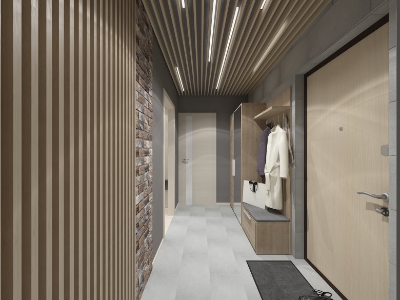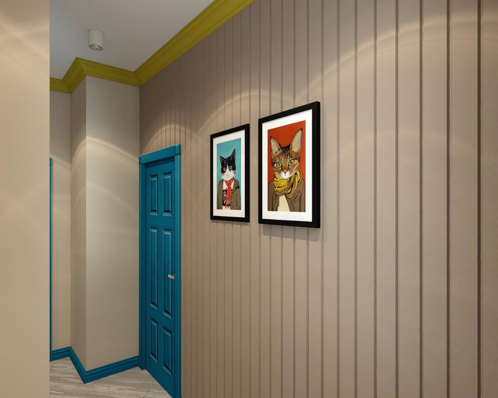 Sulla parete centrale del corridoio, puoi disporre un pannello di pannelli: ottieni un accento luminoso.