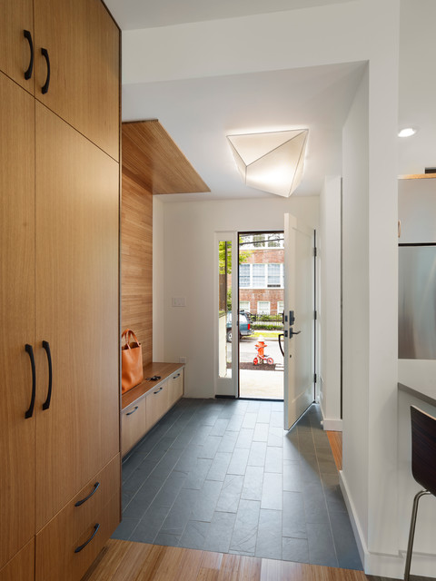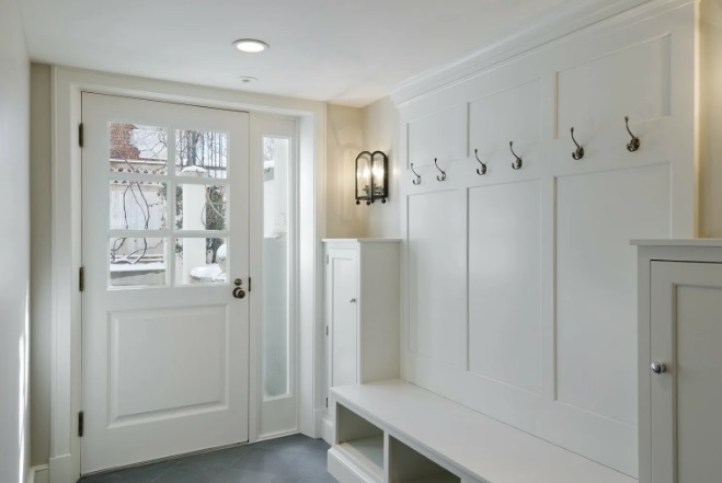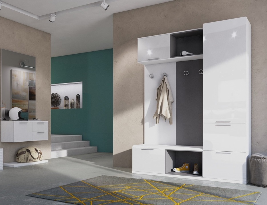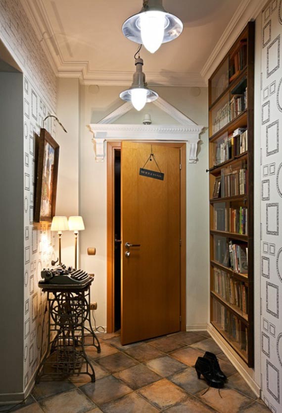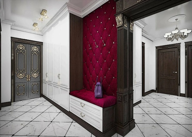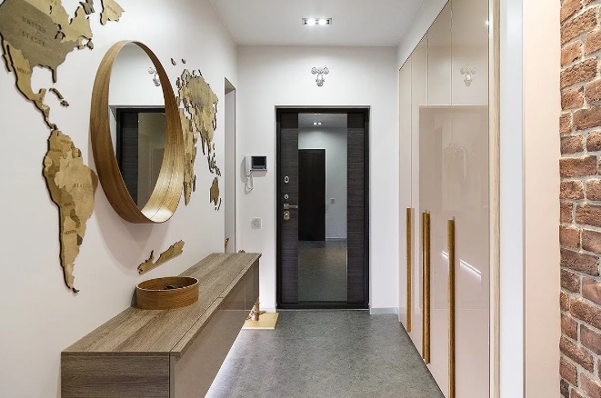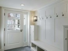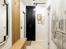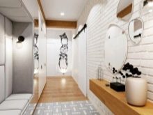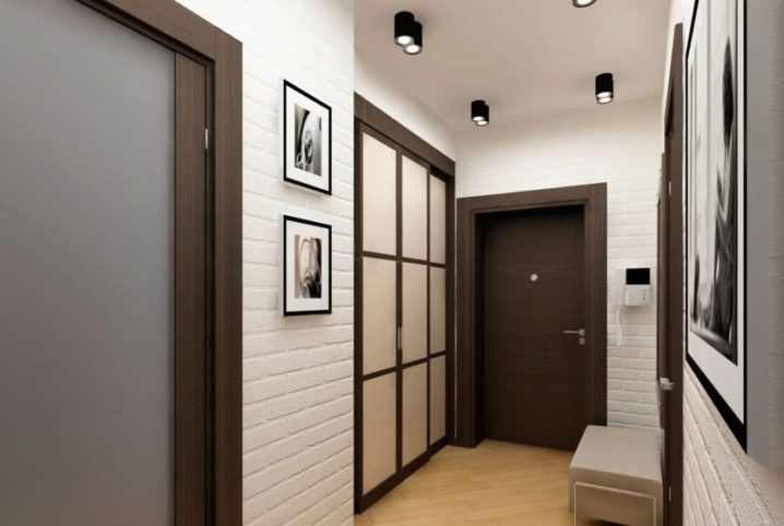 - Elegante ingresso, in cui le pareti sono rifinite con imitazione bianca come la neve di mattoni e i pavimenti sono in laminato chiaro o parquet, può essere equipaggiato con incassi a soffitto neri. Affinché i dispositivi non siano l'unico dettaglio scuro all'interno, le ante delle porte che conducono ad altre stanze dovrebbero essere selezionate nei toni del marrone scuro.