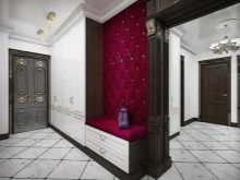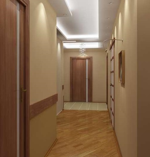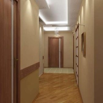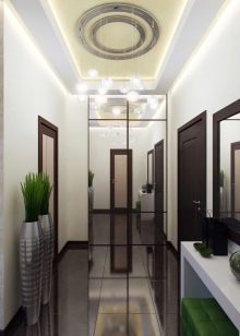 Nel corridoio è possibile installare diversi apparecchi di illuminazione sul soffitto. Se l'altezza dei soffitti lo consente, qui puoi costruire una struttura multilivello in cartongesso e quindi nascondere le strisce LED al suo interno. Al centro della scatola GKL, una tela elasticizzata lucida con faretti sarà bellissima. Una combinazione così chic si adatterà a un corridoio luminoso.