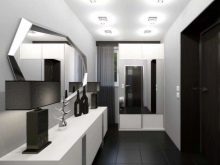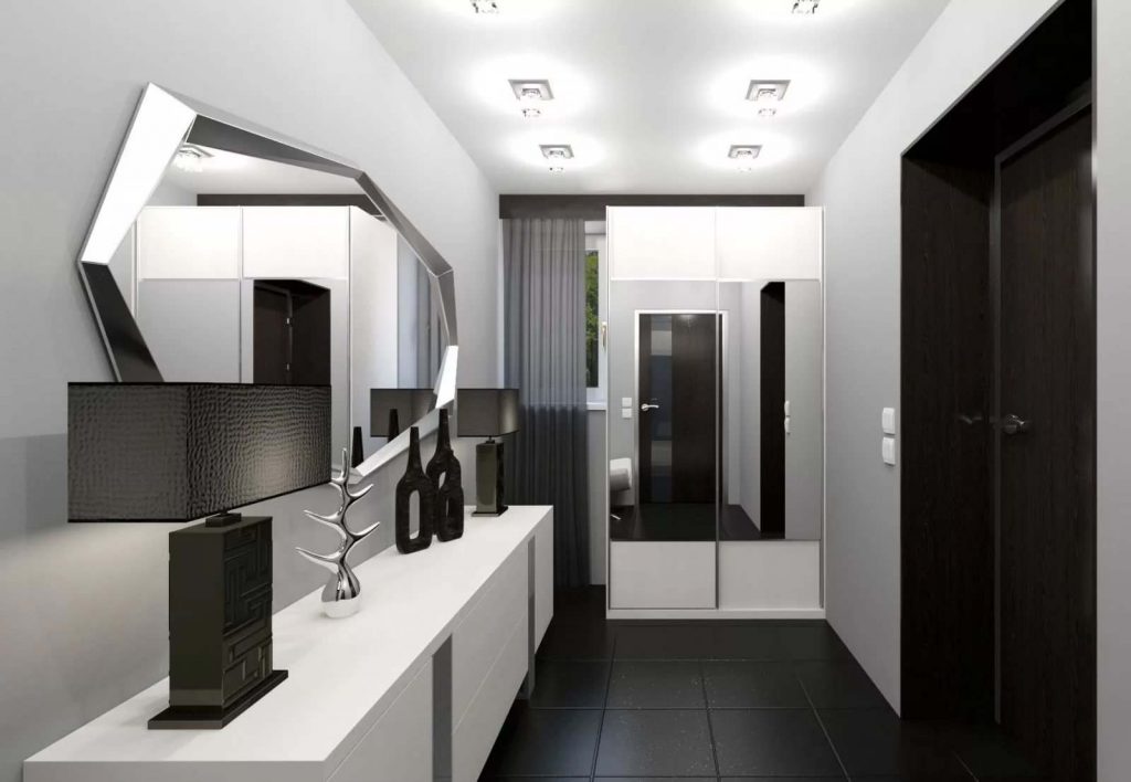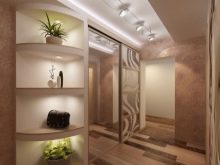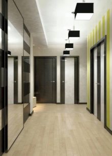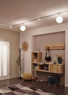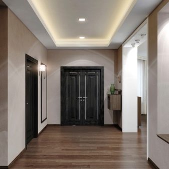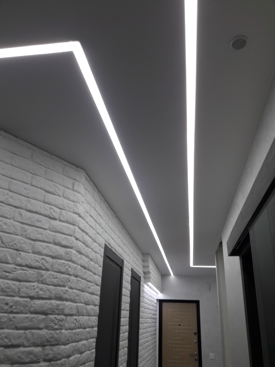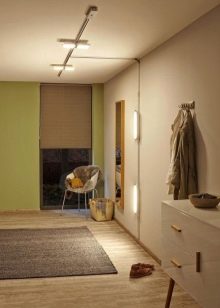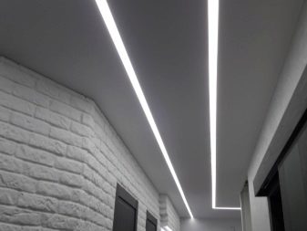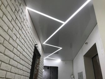 Se il corridoio è realizzato in uno stile moderno e in esso prevalgono solo 2 colori: bianco e nero, quindi l'illuminazione del soffitto sotto forma di linee di luce sembrerà molto originale qui. Quest'ultimo può estendersi lungo l'intera lunghezza del soffitto, dalla porta d'ingresso e oltre. Le linee non devono essere perfettamente diritte. Le curve, le svolte e gli angoli sono accettabili.