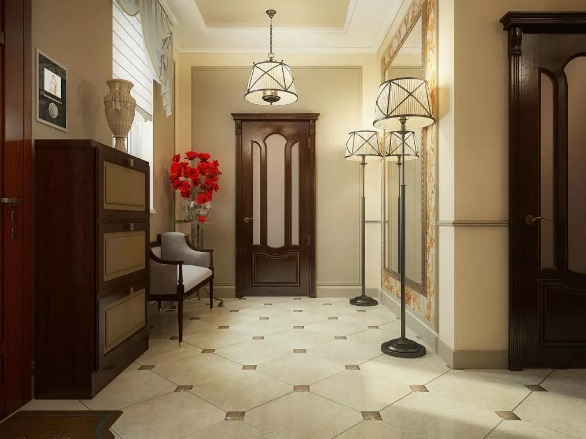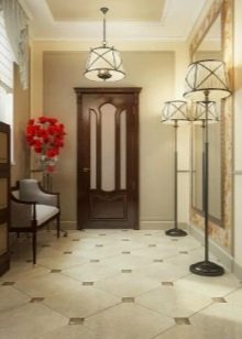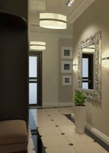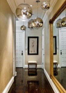 Gli apparecchi di illuminazione a soffitto non dovrebbero essere troppo luminosi. Un'illuminazione eccessivamente potente sarà inappropriata in tali stanze, poiché può immediatamente enfatizzare ed evidenziare tutte le carenze e le carenze della riparazione e della decorazione. Entrando in un tale corridoio da un ingresso buio, le persone possono provare sensazioni spiacevoli.