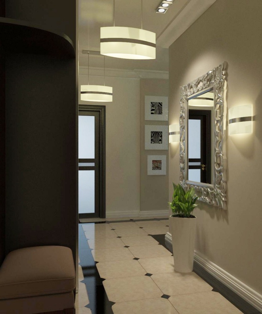 La migliore soluzione per un corridoio è la luce diffusa.... È del tutto possibile ottenerlo attraverso plafoniere opportunamente selezionate. Questo può essere facilitato da sfumature opache. Inoltre, i raggi di luce possono essere diretti verso l'alto in modo da poter essere efficacemente riflessi dai materiali di colore chiaro, creando un'illuminazione uniforme.
