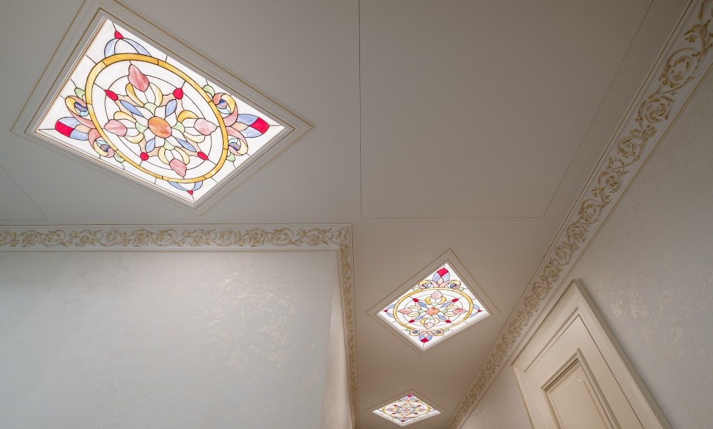 Le ricche lampade in vetro colorato saranno fantastiche in un corridoio lussuoso, progettato in uno stile pretenzioso e colori chiari.... I plinti del soffitto in un ambiente simile possono essere decorati con motivi dipinti in oro. In un'unica combinazione, tali dettagli creano un'atmosfera speciale di lusso.