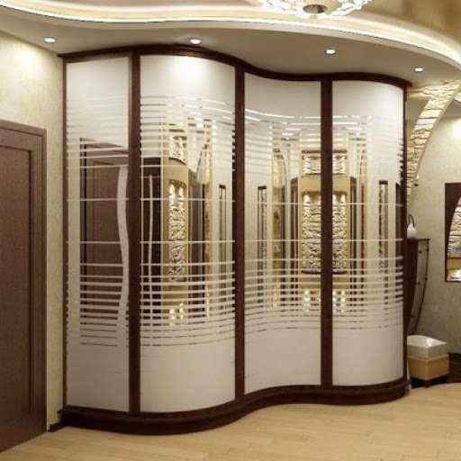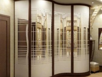 - Modelli di raggio. L'armadio radiale è realizzato a forma di semicerchio con raggio interno o esterno. Questa opzione si distingue per la sua forma non standard. Ci sono molti prodotti che hanno una forma ondulata arrotondata, concava o asimmetrica. Tali contorni originali rendono la stanza più aggraziata, portando un certo gusto all'interno.