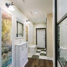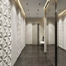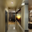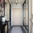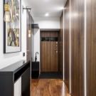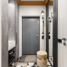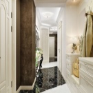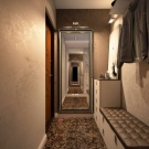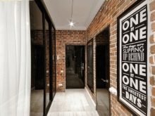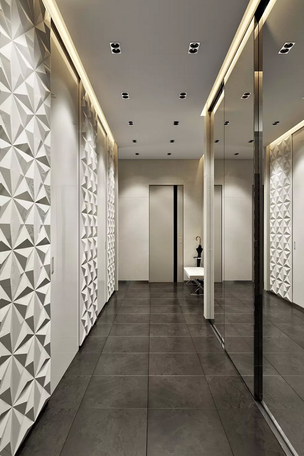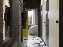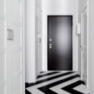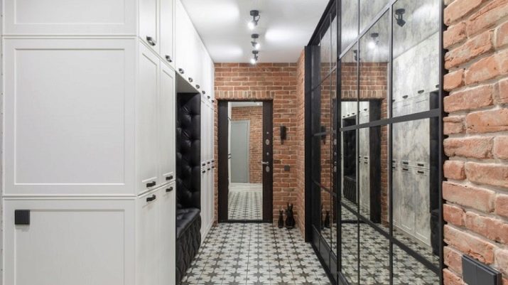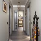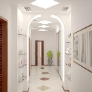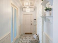 La seconda parte della stanza sembra più sobria. La muratura leggera viene utilizzata per decorarlo. Il colore delle pareti si sposa bene con la finitura chiara del pavimento. Le belle lampade rendono la stanza più luminosa. Il corridoio, grazie a questo design, sembra accogliente e bello.